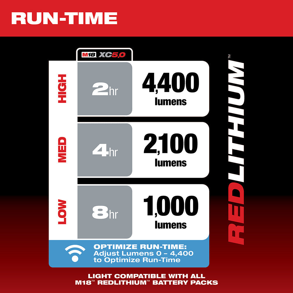 Most versatile light on site - customize, track, manage the new M18™ RADIUS™ LED compact site light with ONE-KEY™ is the world’s first high output cordless site light on the market, and has the ability to provide light in task, area, and overhead applications. With 4,400 lm of TRUEVIEW™ high definition output, the M18™ RADIUS™ LED compact site light provides enough light to illuminate large work areas, and can be turned down to as low as 1,000 lm for working in confined areas. A high impact polycarbonate lens, and IP54 ingress protection allows it to live in the toughest conditions. The combination of these technologies offers professionals the highest quality LED lighting solution, on or off the jobsite.