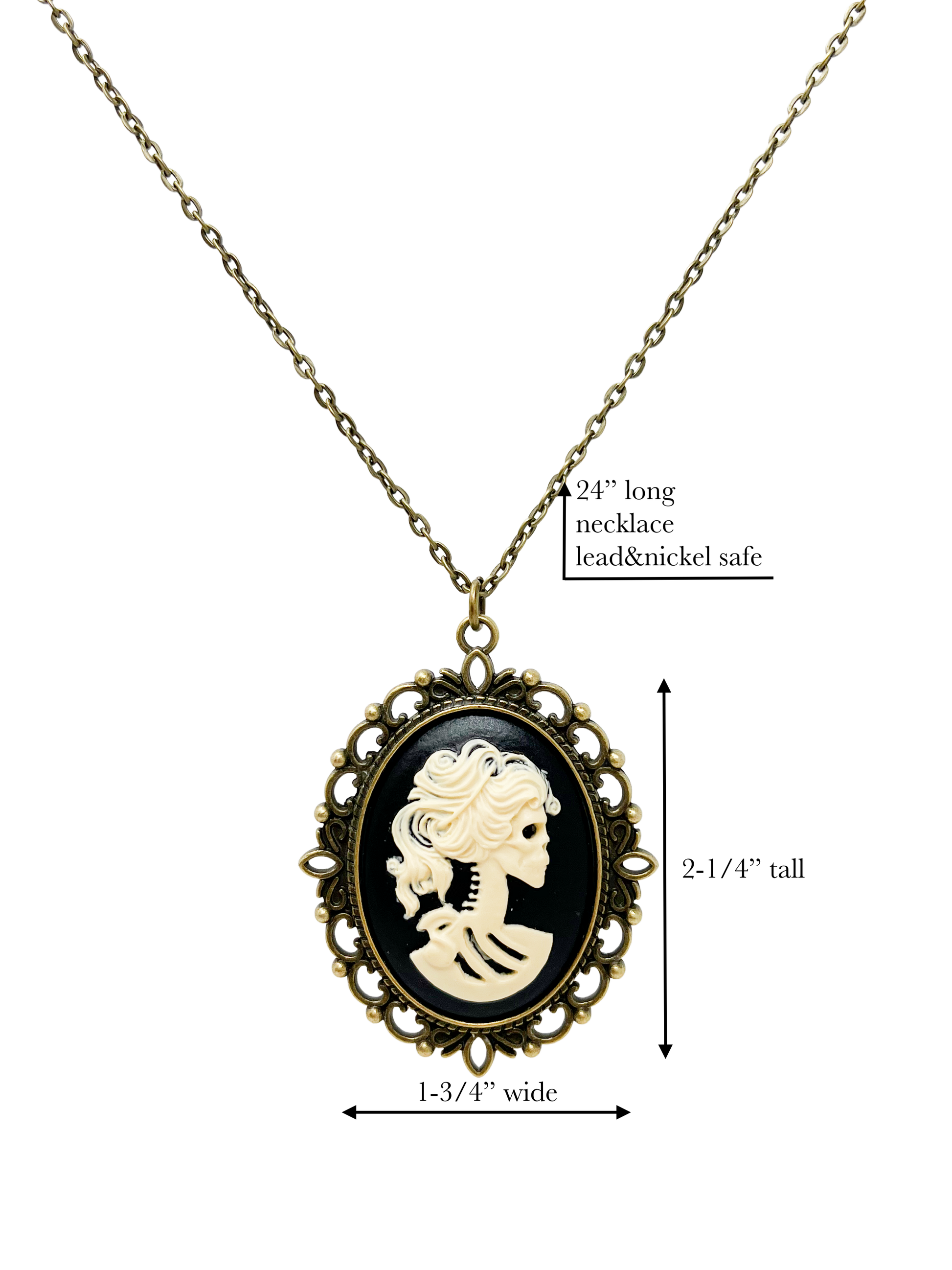 - bronze tone, goth style pendant setting is about 2-1/4" x 1-3/4" ivory lady skeleton over black cabochon
