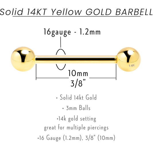 Solid 14k Yellow Gold Barbell Straight Barbell Ring 16G 3/8 3mm