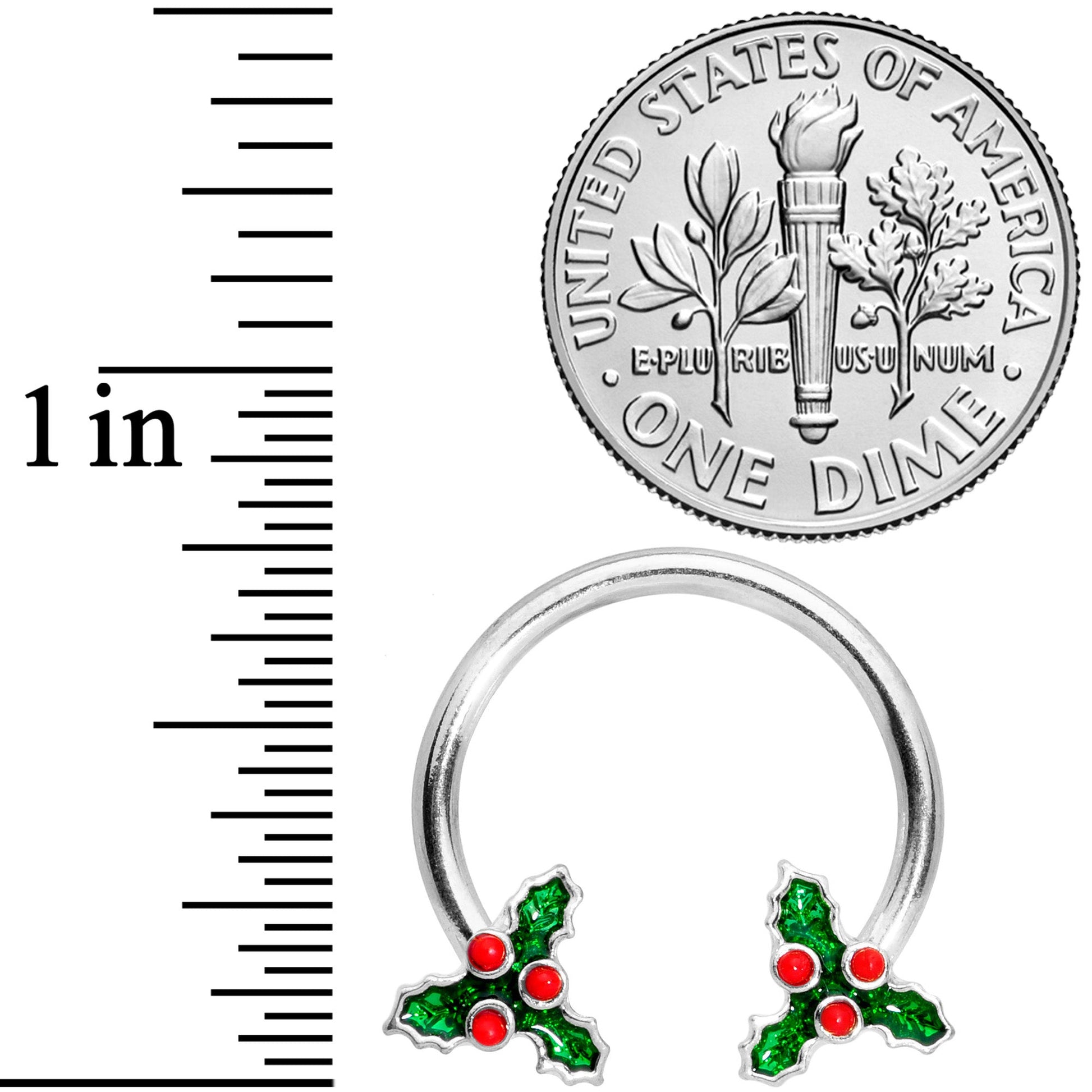 14 Gauge 9/16 Holly Christmas Horseshoe Nipple Ring Set