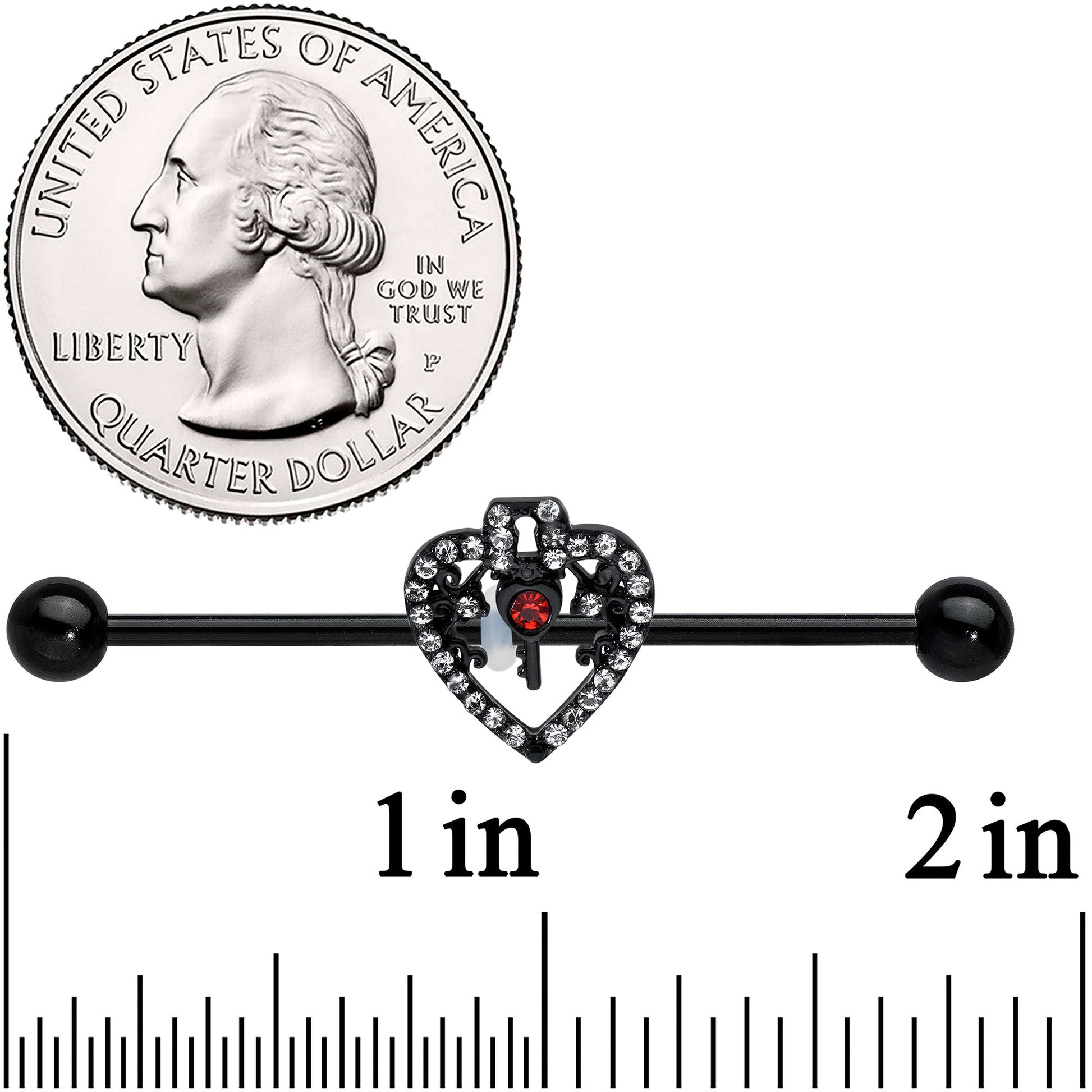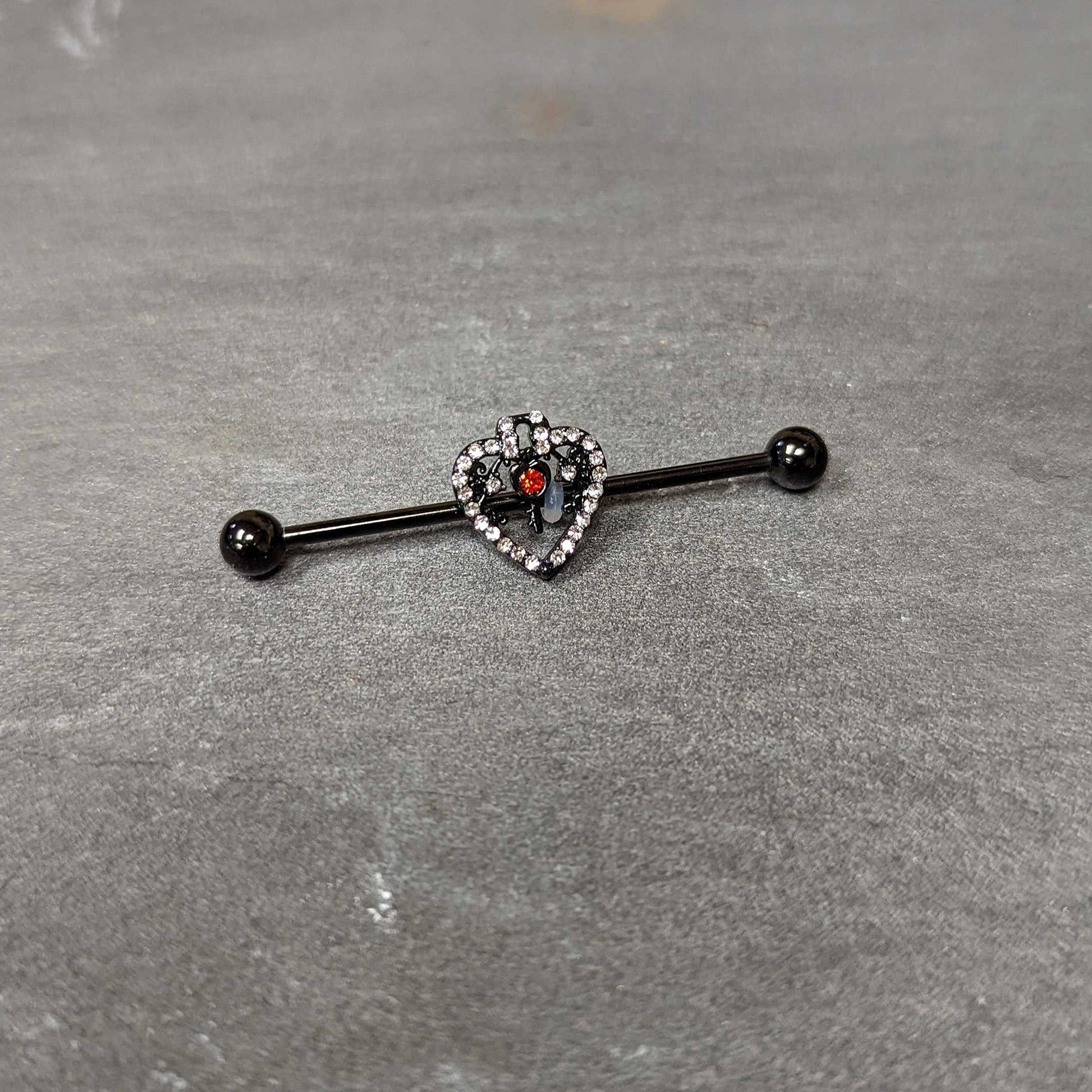 14G Clear Red Gem Black Key Heart Industrial Barbell 38mm