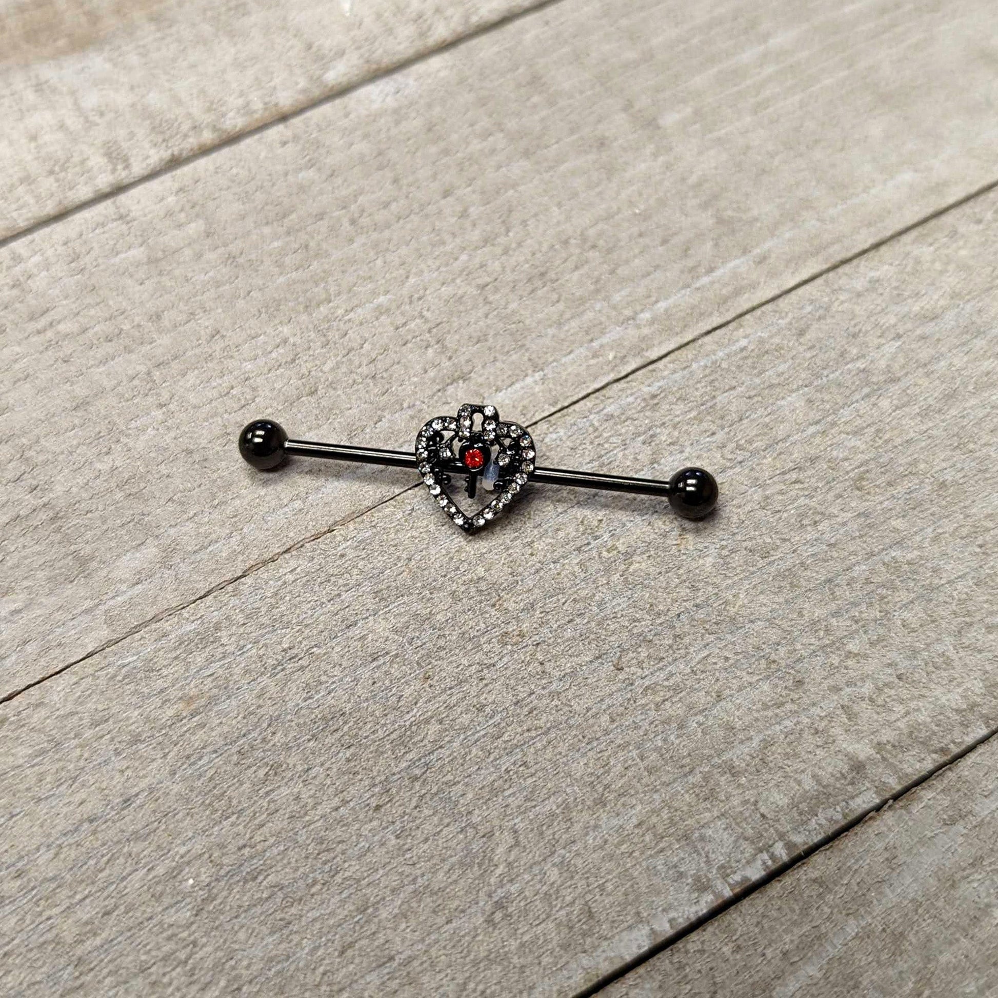 14 Gauge Clear Red Gem Black Key Heart Industrial Barbell 38mm