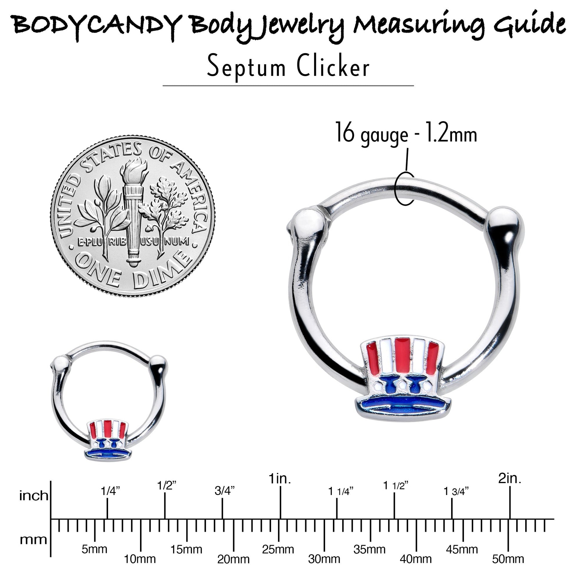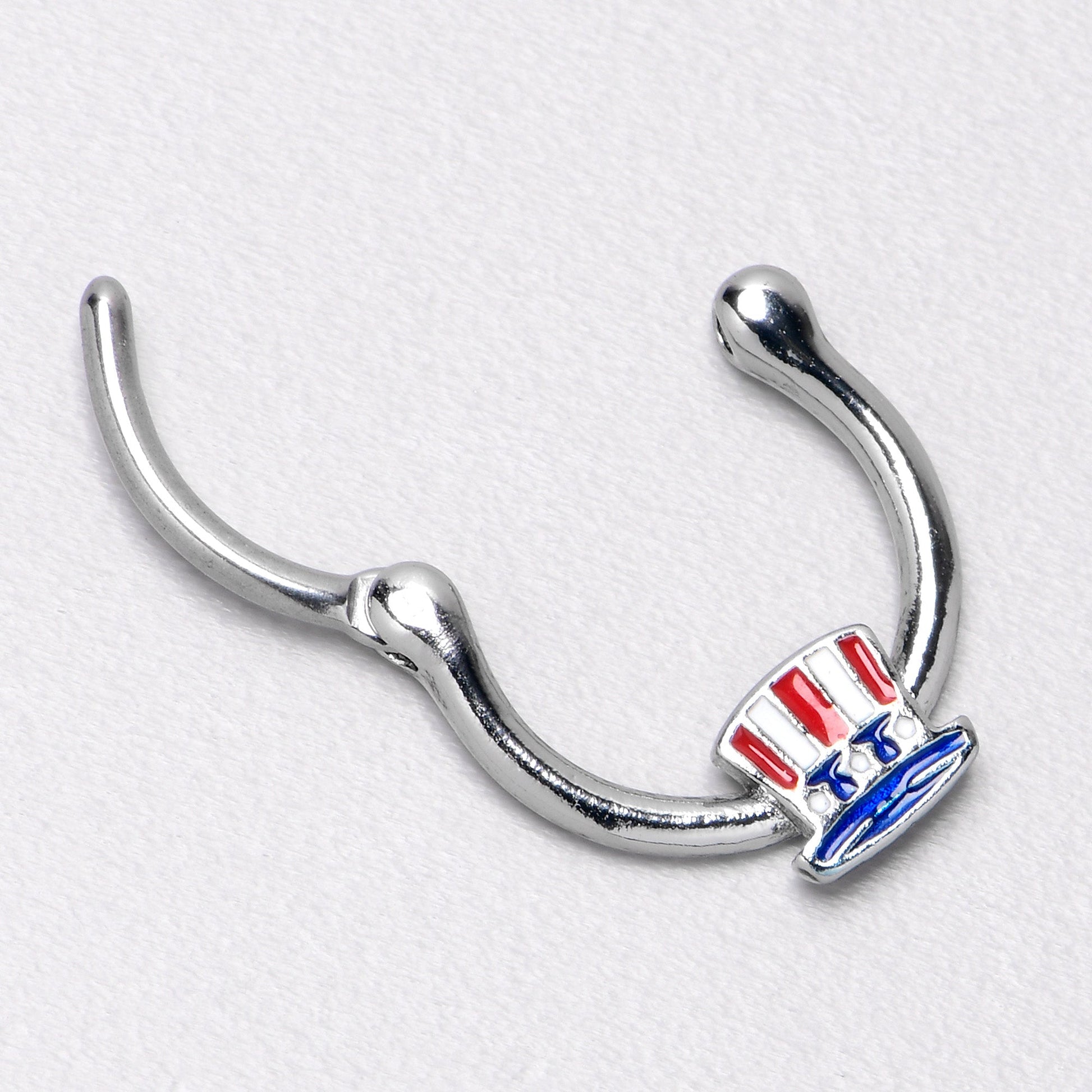 Uncle Sam himself couldn't feel more patriotic than this 16 gauge septum ring. It is made with a 10mm durable 316L surgical grade stainless steel hinged curved barbell. It features a top hat with red and white stripes and a blue brim, with blue detailing on the band. The clicker design makes insertion and removal a snap and you can even rock this snappy hat in multiple piercings including daith, helix, and some conch piercings. You will be patriotic to the max with this top hat cartilage piercing jewelry.Specifications