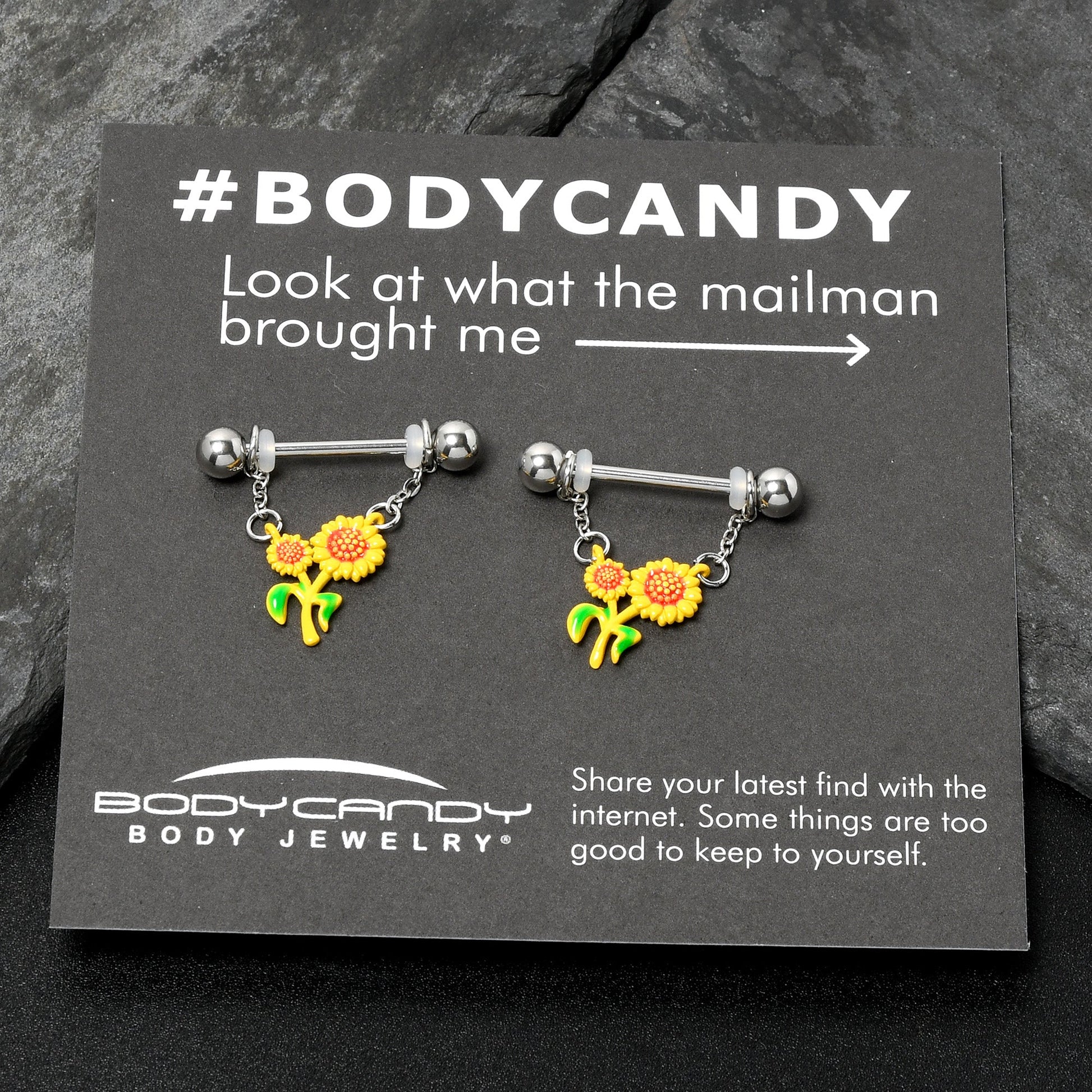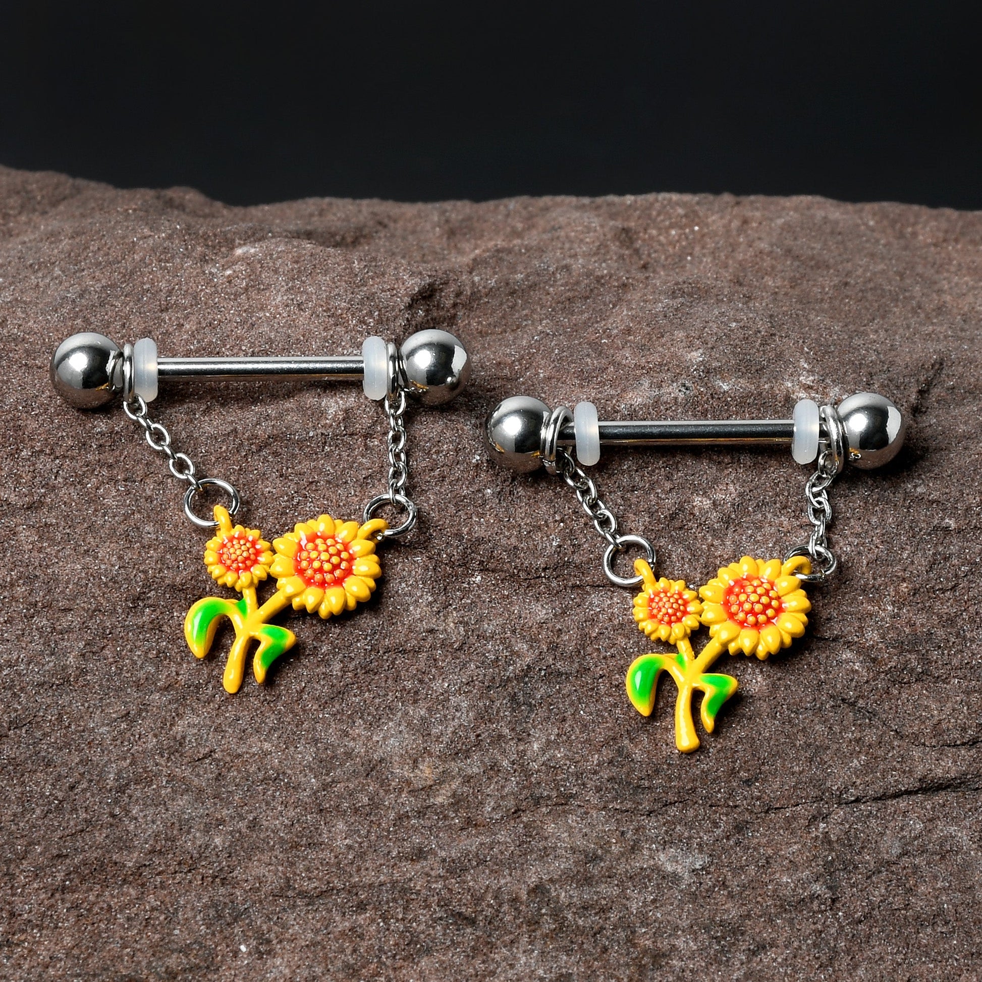 14 Gauge 9/16 Happy Sunflower Duo Chain Dangle Nipple Ring Set