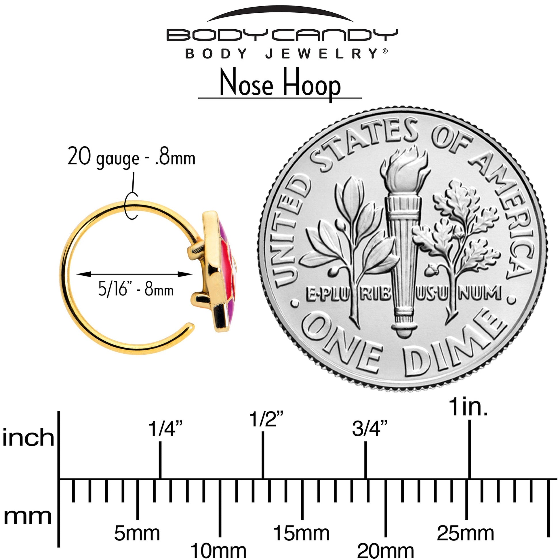 There won't be anything fishy going on when you're rocking these 20 gauge nostril rings. They're made with 8mm gold tone PVD over 316L surgical grade stainless steel circular rings. Each one features a tropical fish charm, set in strikingly bold colors. You get one with black and orange stripes, one in pink and purple, and one with white and orange stripes with green embellishments. Rock your own personal aquarium with this fabulous fish nose piercing jewelry. Sold as a set of three.
