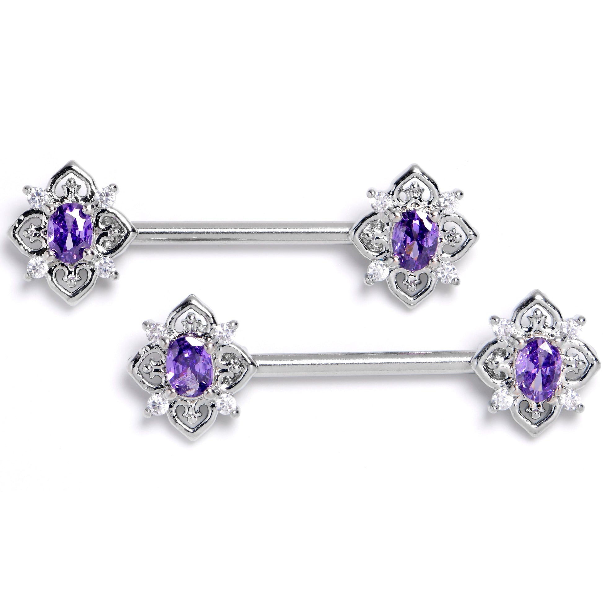 14G 9/16 Purple Gem Lace Look Hearts Barbell Nipple Ring Set