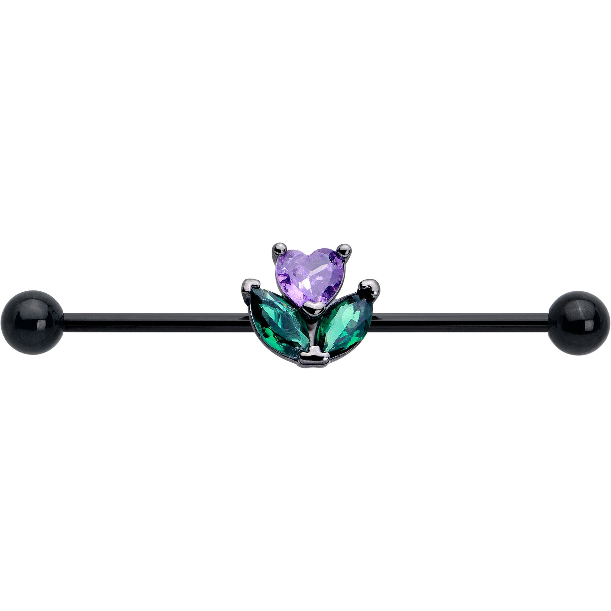 14 Gauge Purple Green CZ Gem Black Love Flower Industrial Barbell 38mm