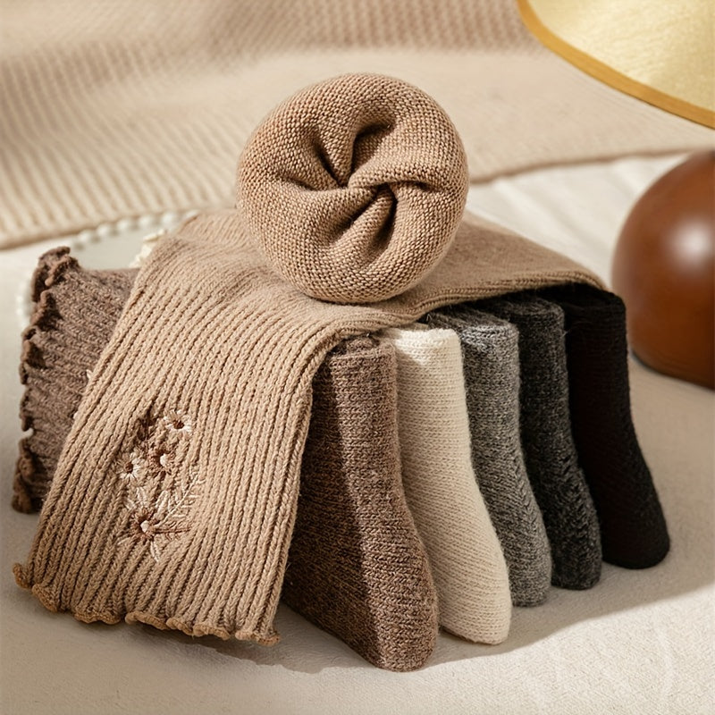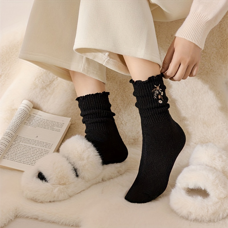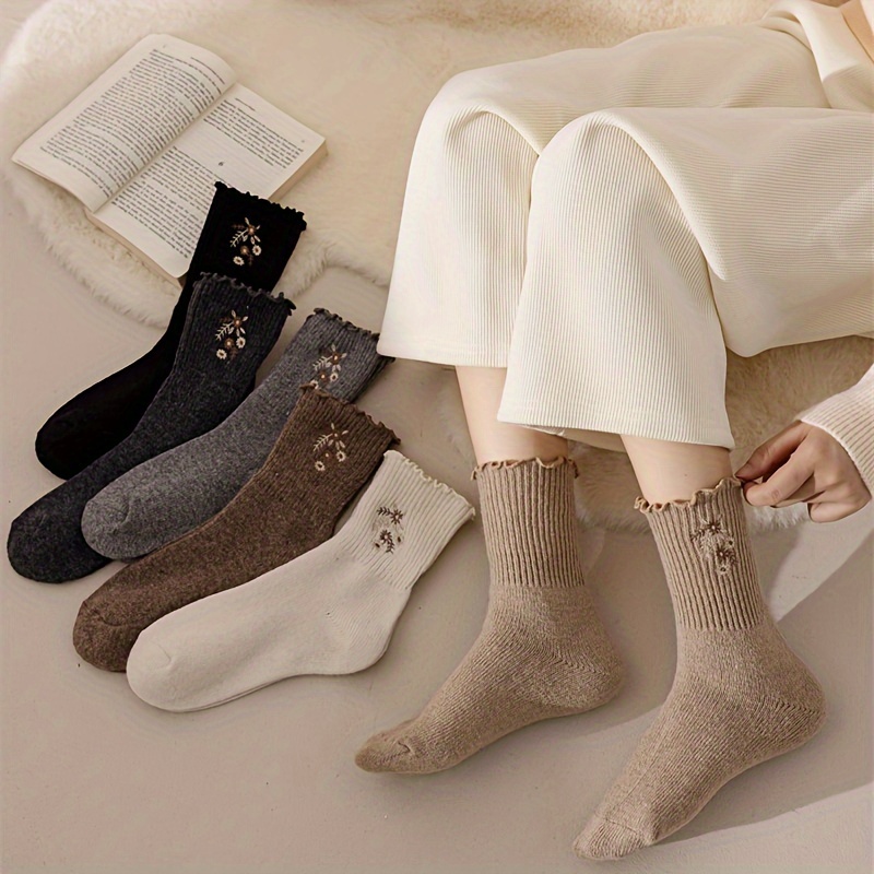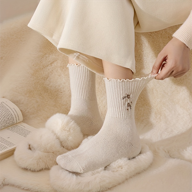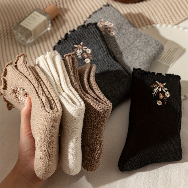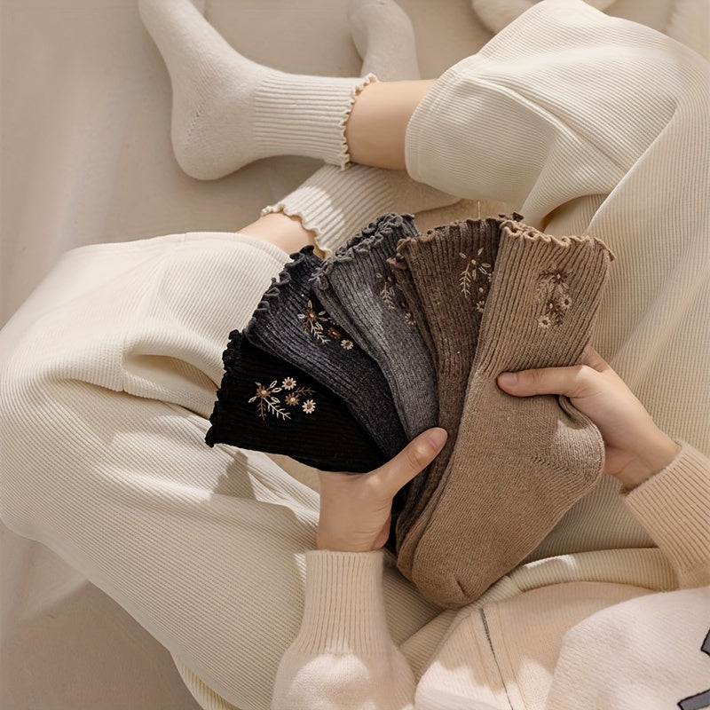6 Pairs Floral Embroidery Socks, Comfy & Soft Lettuce Trim Socks, Women's Stockings & Hosiery