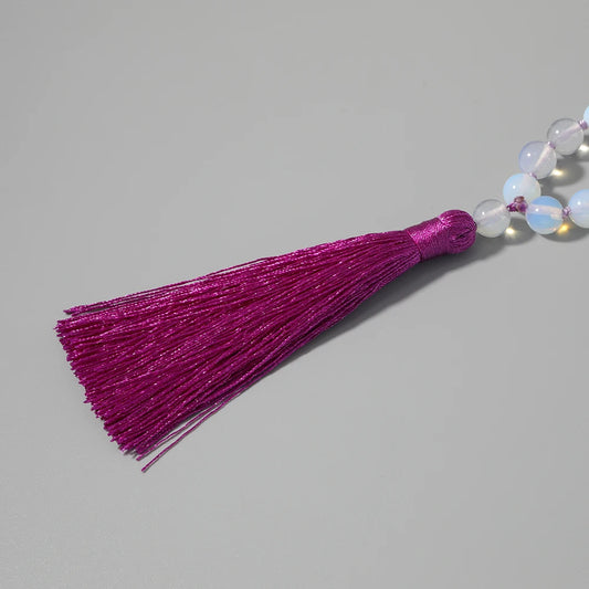 8mm Opal Hand-Knotted 108 Mala Beads Necklace with Tassel for Meditation, Yoga, and Prayer