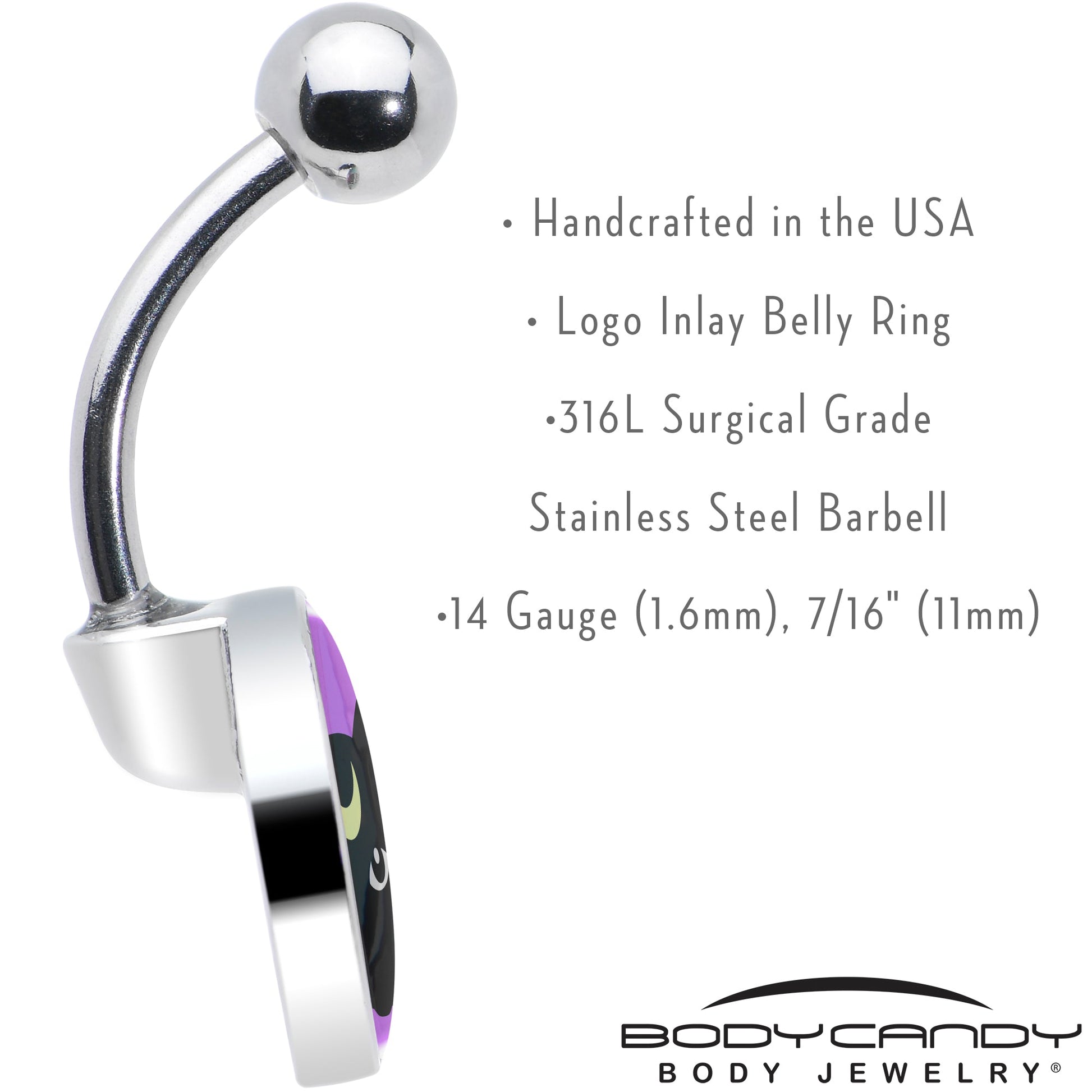 The cat on this 14 gauge navel ring appears to have been blessed with mystic wisdom. It's made with a 7/16 inch 316L surgical grade stainless steel curved barbell with a 5mm top ball end. It features a purple disc charm with a black cat's face on it. The cat has simply detailed eyes and a crescent moon on its forehead. Let this cryptic kitty cat cast a spell of style on your look with this delightfully mystical belly piercing jewelry.