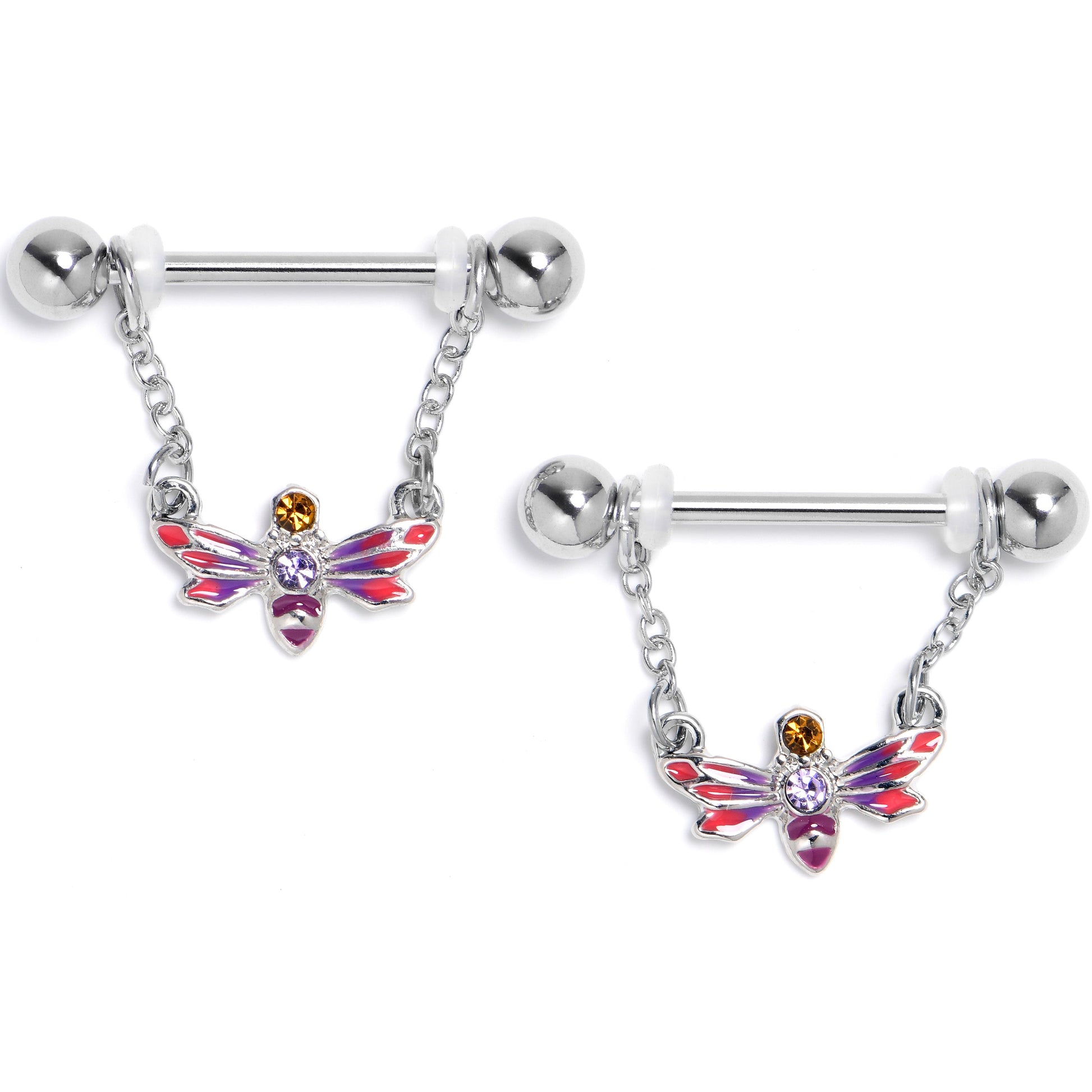 The delightful dragonflies on this 14 gauge nipple jewelry are so lovely it is almost magical. It is made with 14mm durable 316L surgical grade stainless steel straight barbells with 5mm ball end. Each barbell supports a double length of matching chain that features a dragonfly charm, with striped bodies and wings for lovely touches of color. They also feature purple and yellow gem embellishments for added glamour that will cast a spell on you. Give your look a touch of nature with these delicious dragonfly nipple piercing rings. Sold as a set of two.