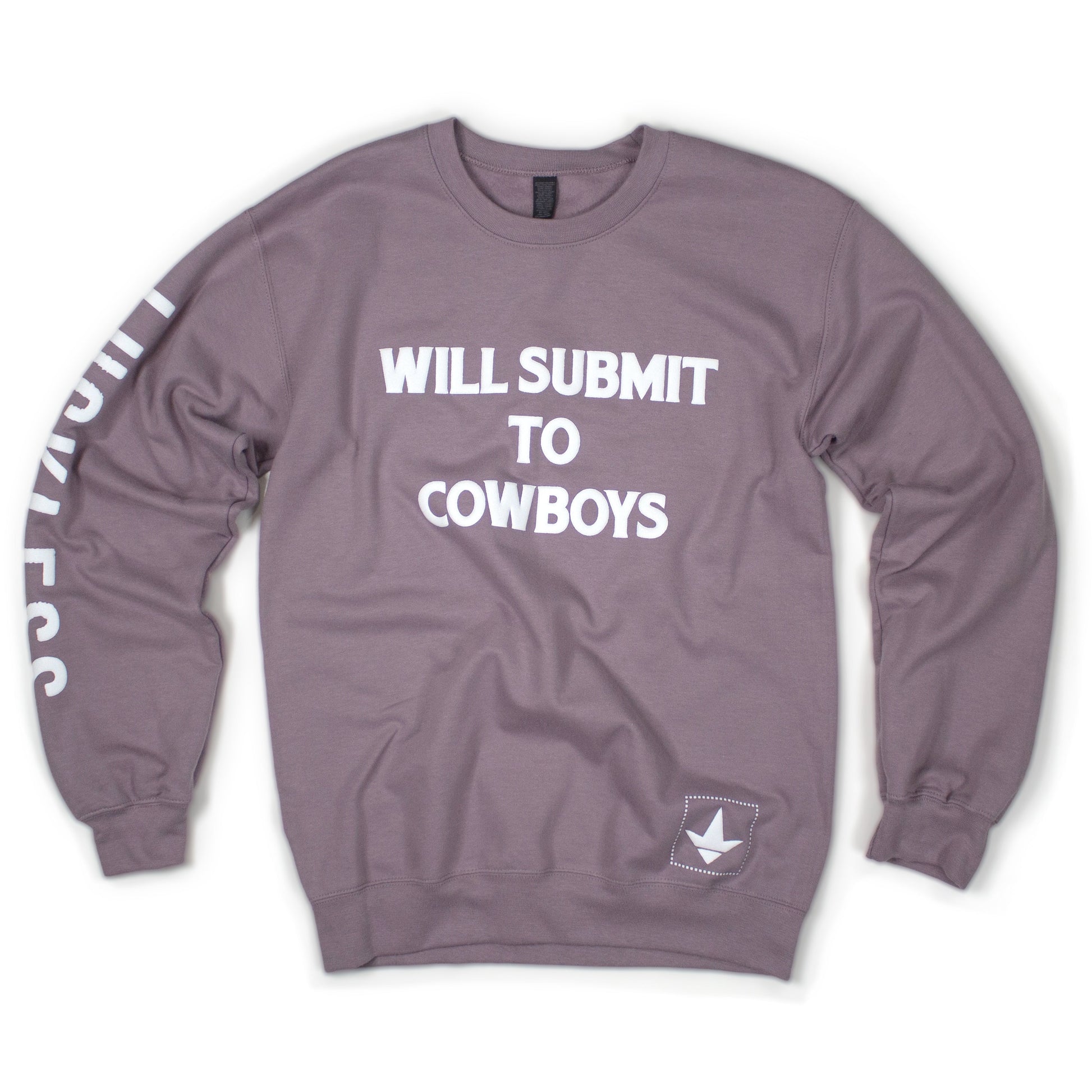 Introducing our fabulous fleece sweatshirt, specially designed for women who aren't afraid to embrace their fun and cheeky side! With the hilarious phrase "will submit to cowboys" proudly displayed on the front in Puff Ink, you'll not only make a statement but also enjoy the delightful raised texture that adds a tactile charm to your outfit.