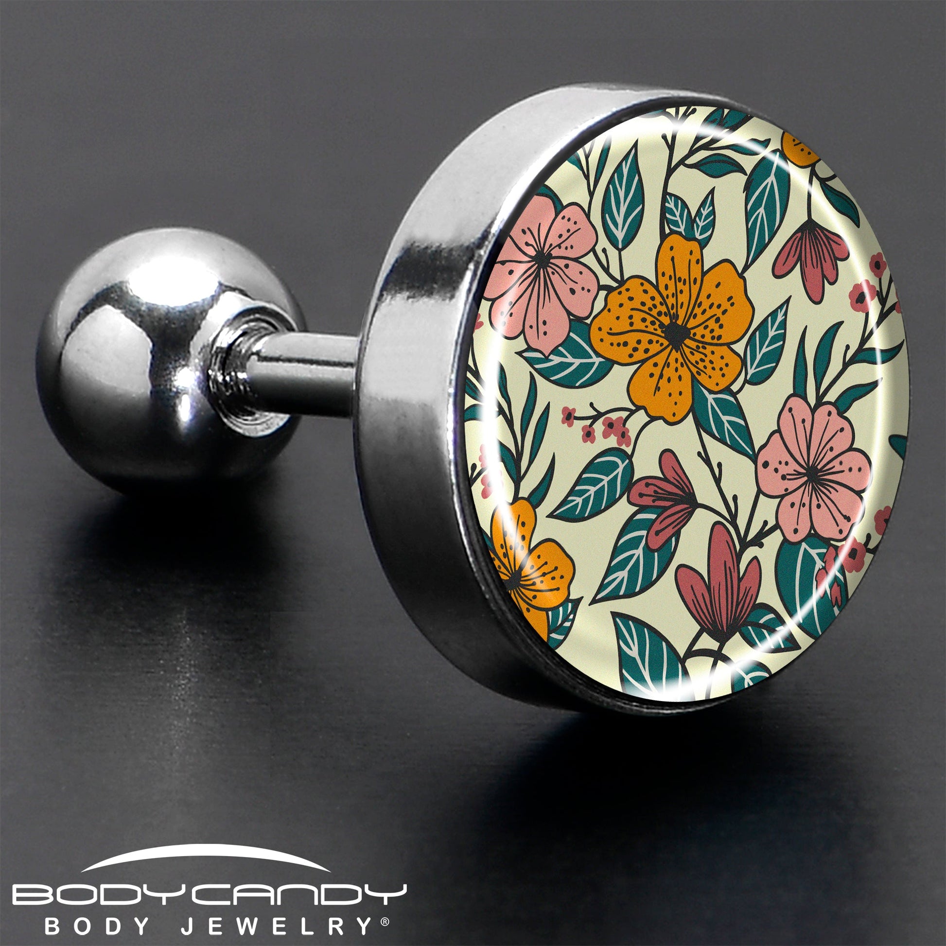 This 16 gauge artist hand drawn flower cartilage jewelry is part of our new line of Blossom Creations body piercing jewelry for the season. This 6mm tragus stud is made with a 316L surgical grade stainless steel straight barbell with a 4mm ball end. It features a logo inlay charm with an array of earth-toned wildflowers. You can even rock it in multiple piercings including tragus, helix, and some conch piercings. Get a little wild and let style bloom with this fabulous floral cartilage piercing jewelry.