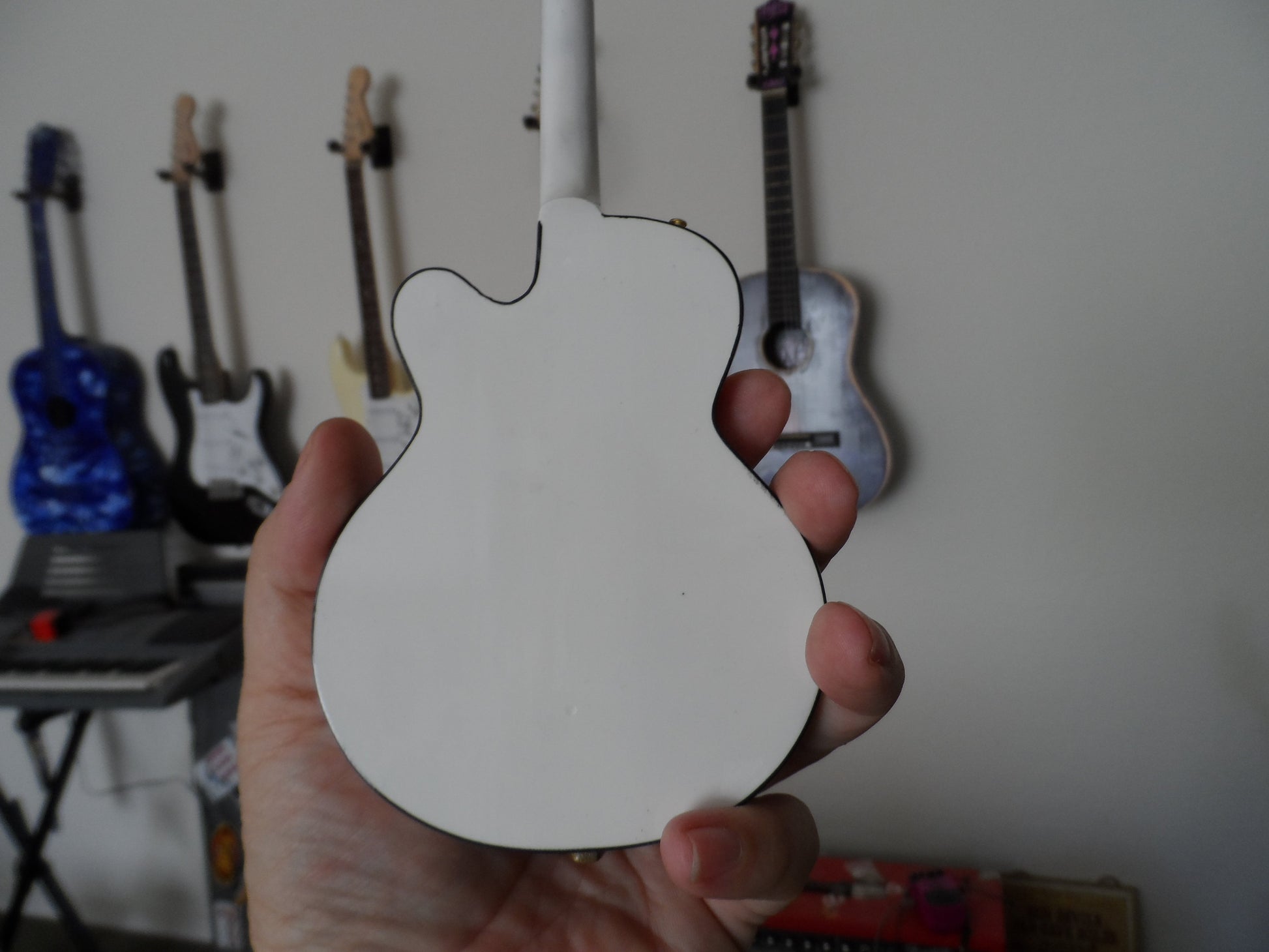 This miniature 1:4 scale replica model instrument can fit in the palm of your hand.  It is approximately 10.5 inches in length and comes with an adjustable display stand and is packaged in a guitar gift box.  Each guitar is individually handcrafted from solid woods, plastics, resins, etc. (depending on the guitar style) with metal tuning keys.  Check out our listings for guitar hard cases, display boxes and miniature amplifiers to complete your guitar set-up.