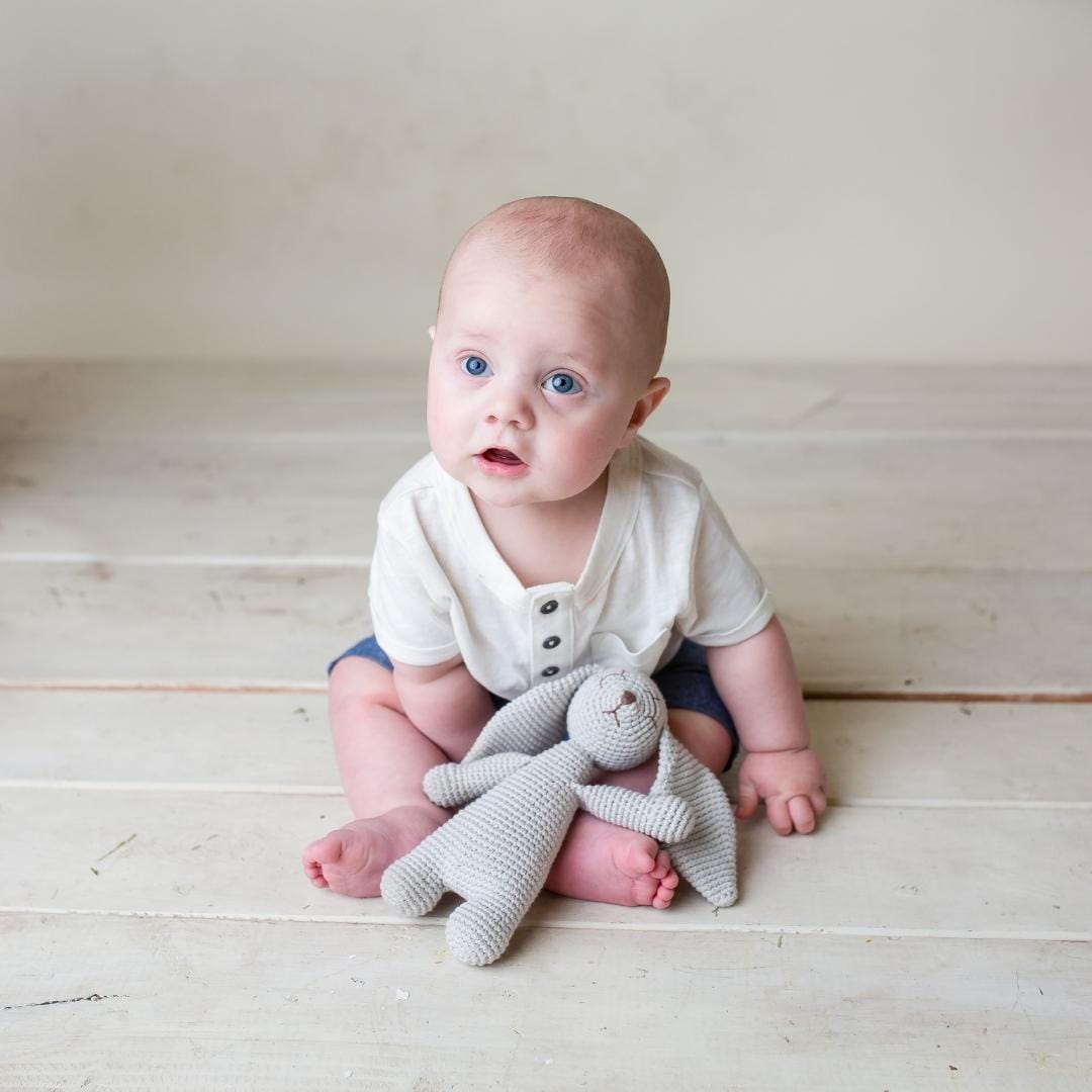 Meet Ginger the Sleepy Bunny, your baby’s first best friend. Hand-crocheted from the softest organic cotton, Ginger’s gentle expression and floppy ears make her the perfect cuddle companion for naps, playtime, or quiet moments.