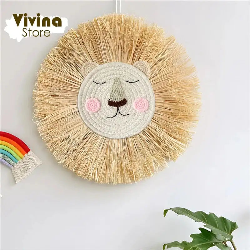 Nordic Hand Woven Lion Wall Hanging Ornaments Cartoon Animal Head Straw Weaving Children Room Wall Decor Tent Party Decoration