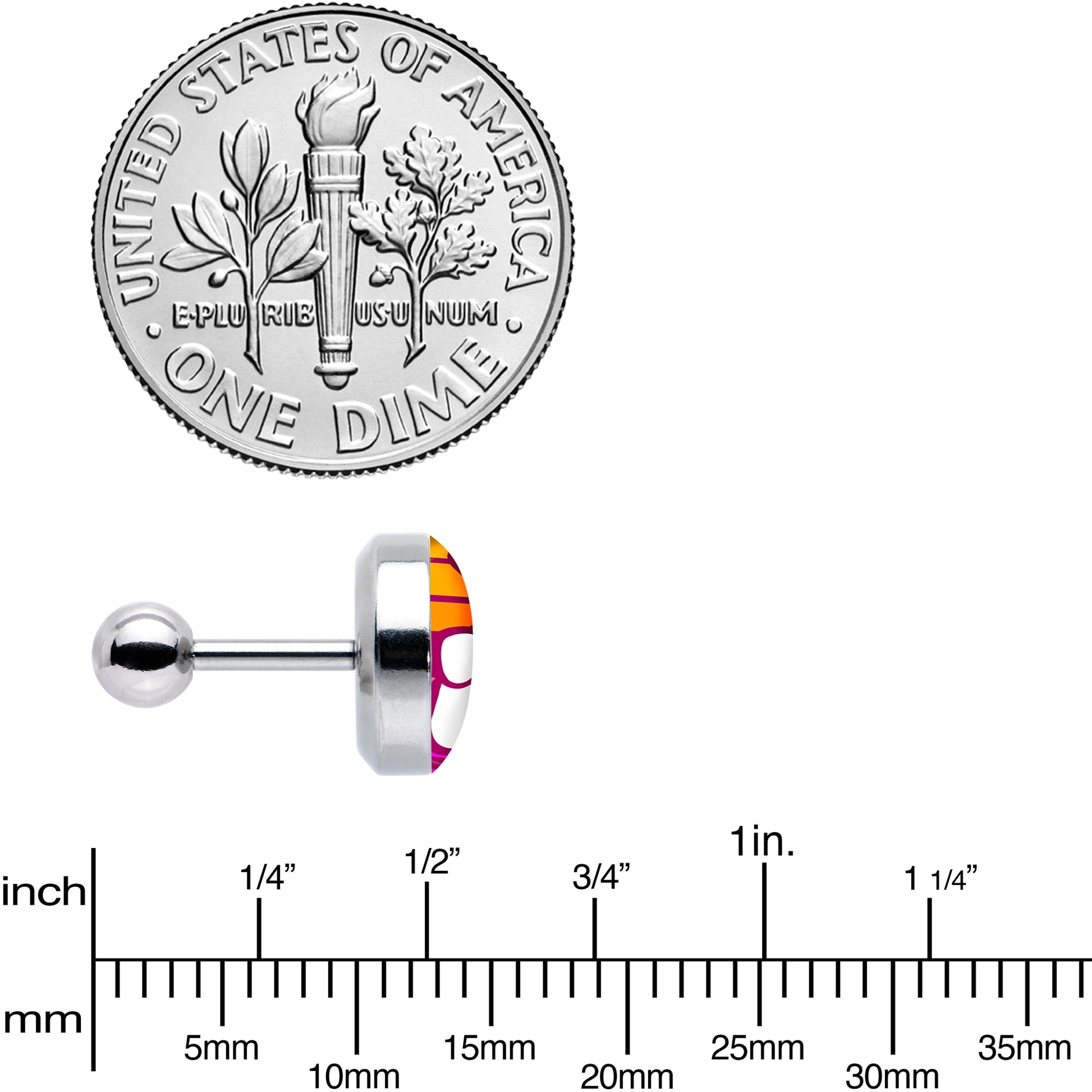 Let your cartilage piercings speak words of peace with this 16 gauge tragus stud. It is made with a 6mm durable 316L stainless steel straight barbell with a 4mm ball end. It features a disc charm of a hand giving the classic peace sign from the 1960s. The hand is further embellished with a striped background that shades from purple to orange. You can even rock it in multiple piercings including tragus, helix, and some conch piercings. You will be feeling the peace and love with this classic peace sign cartilage piercing ring.