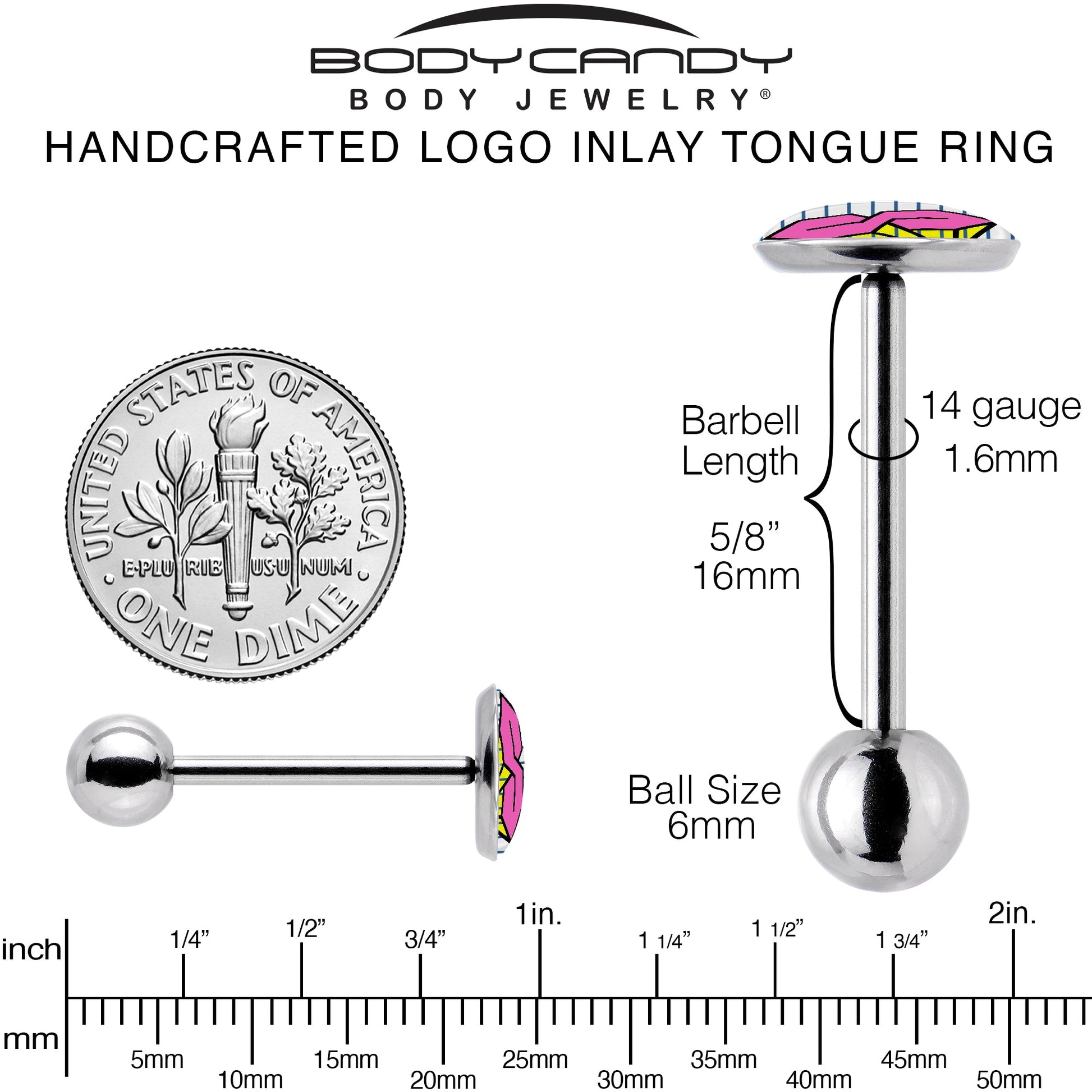 Get some retro school style with this 14 gauge throwback S tongue barbell. It's made with a 5/8 inch 316L surgical grade stainless steel straight barbell with a 6mm bottom ball end. The top end features a striped, white disc logo charm that resembles a piece of notebook paper. In the center is a hot pink S, stylized like the one everyone used to draw in their school notebooks, and embellished with yellow detailing. Take your look back to school with this retro tongue piercing jewelry.