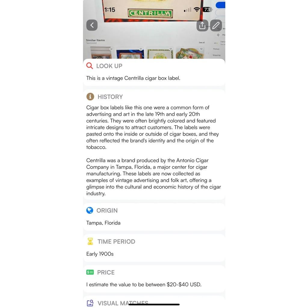 Seize this rare opportunity to own a piece of Florida's rich cigar-making heritage! This Antique Centrilla embossed cigar label is not just a collector's item; it's a tangible link to America's industrial past. Museums and art departments across the country eagerly seek such artifacts for their historical significance and artistic merit. By acquiring this label, you're not only preserving a slice of history but also investing in a highly sought-after piece of Americana.