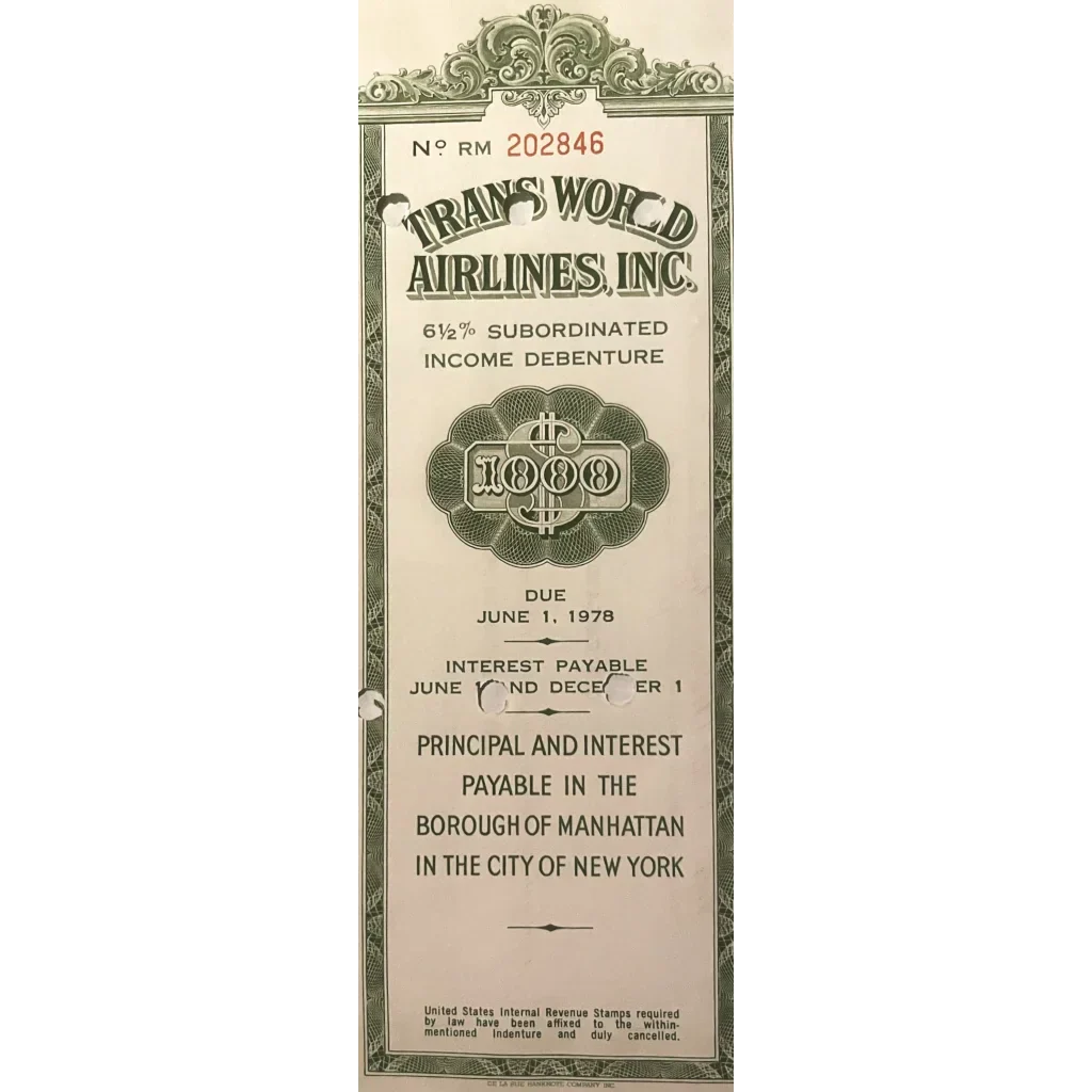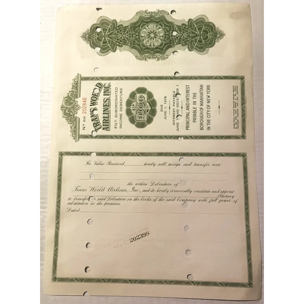 Imagine the thrill of owning this extraordinary piece of aviation history, proudly displayed on your wall as a conversation-starting home decor item. These bond certificates are becoming increasingly scarce, with many finding their way into prestigious museums and private collections. They represent more than mere paper; they are historical documents with centuries of fascinating stories behind them. From the first stock certificate issued by the Dutch East India Company in 1606 to one of the last paper stock certificates from a major corporation issued by the Walt Disney Company in 2013, these artifacts span over four centuries of financial and industrial history. Don't let this opportunity to own a piece of TWA's golden age slip through your fingers!