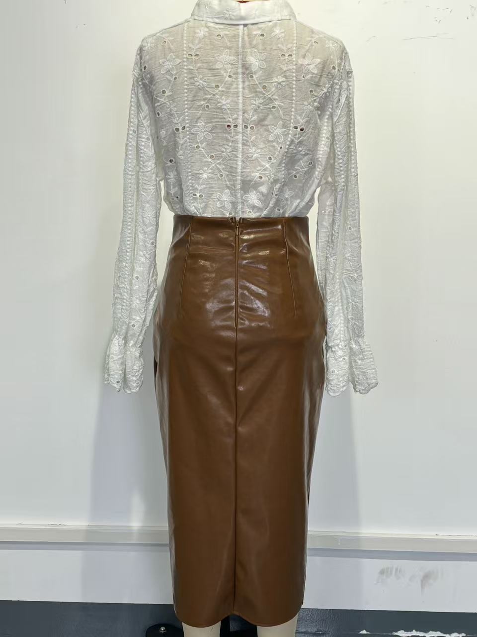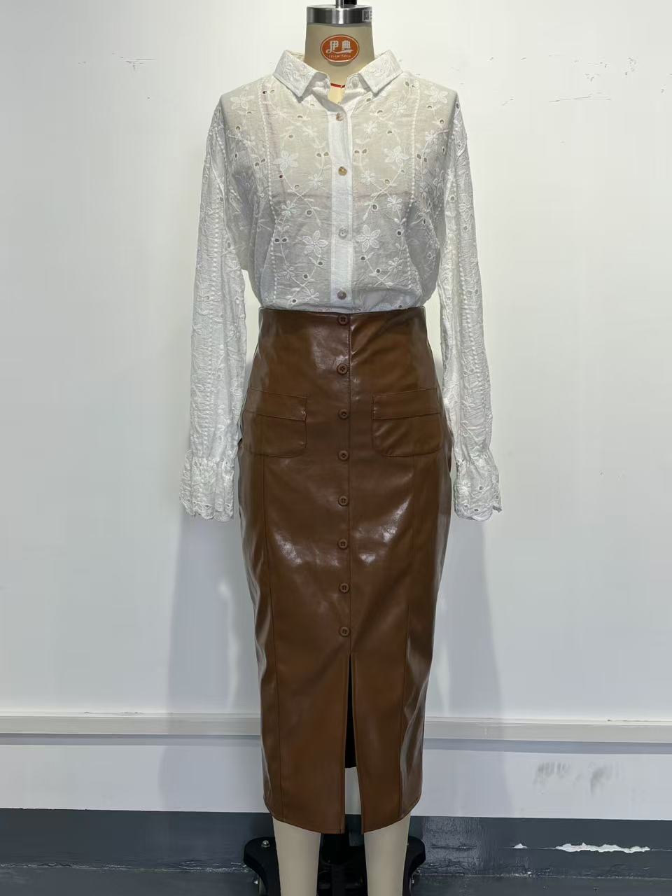 Autumn Winter Faux Leather Women Skirt Sexy Button Slit Slim Fitting High Waist Long Sheath Skirt