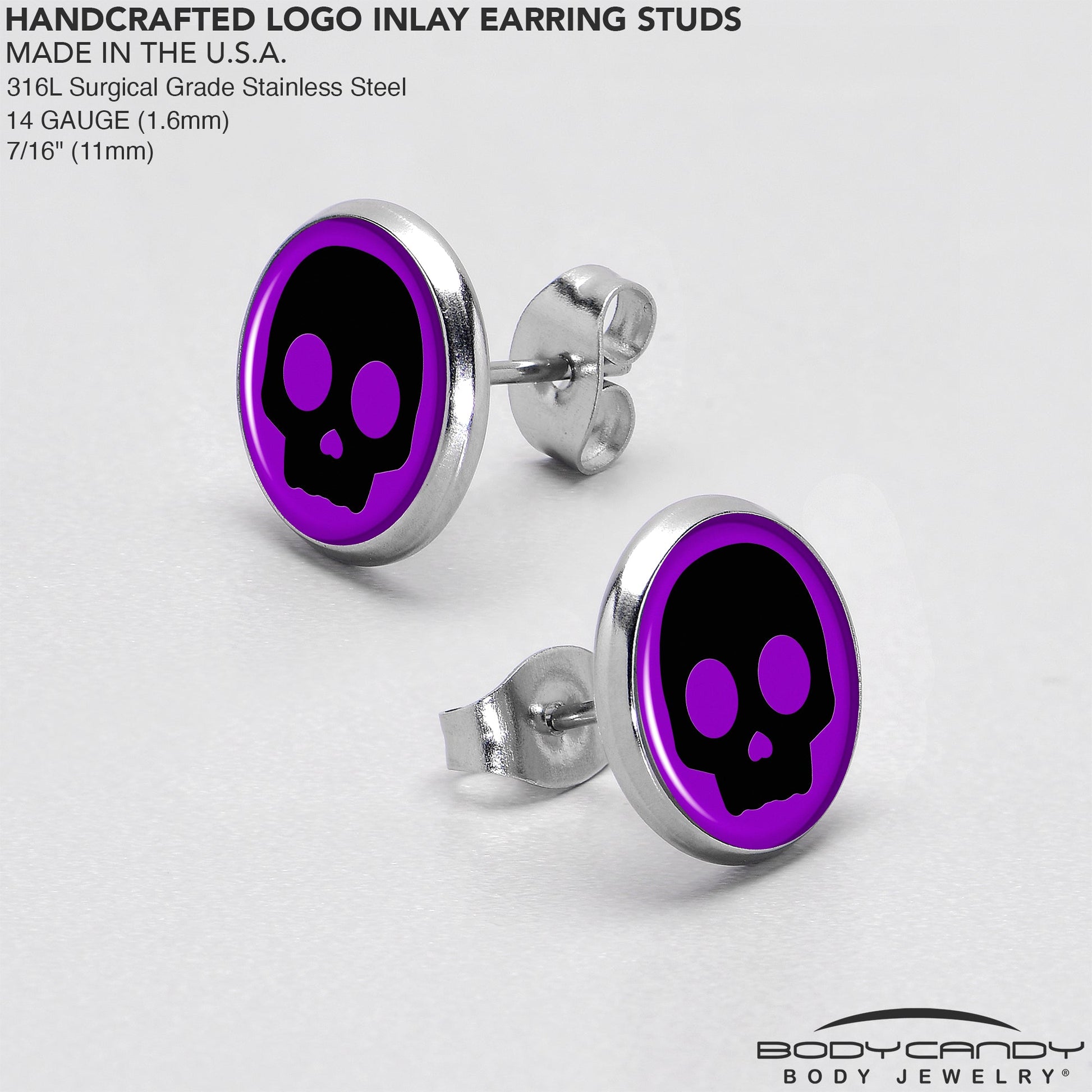 Get a look that will strike 'em dead with these stud earrings for pierced lobes. They're made with stainless steel straight posts with friction backs for a secure fit. Each one features a simple silhouette of a black skull on a purple background. You'll totally knock 'em dead with these gothic skull earrings. Sold as a set of two.