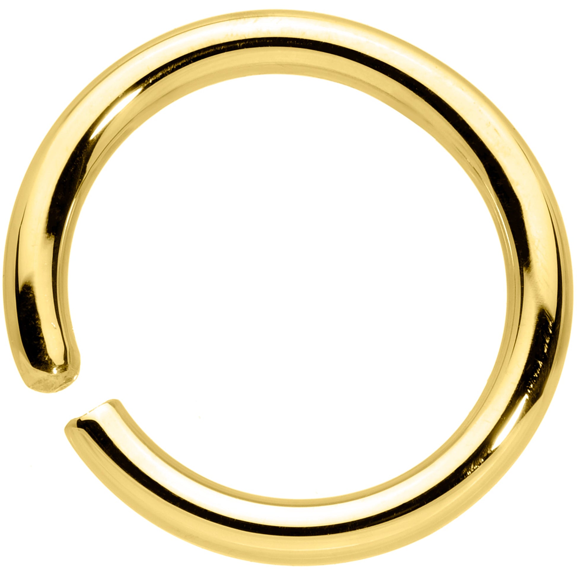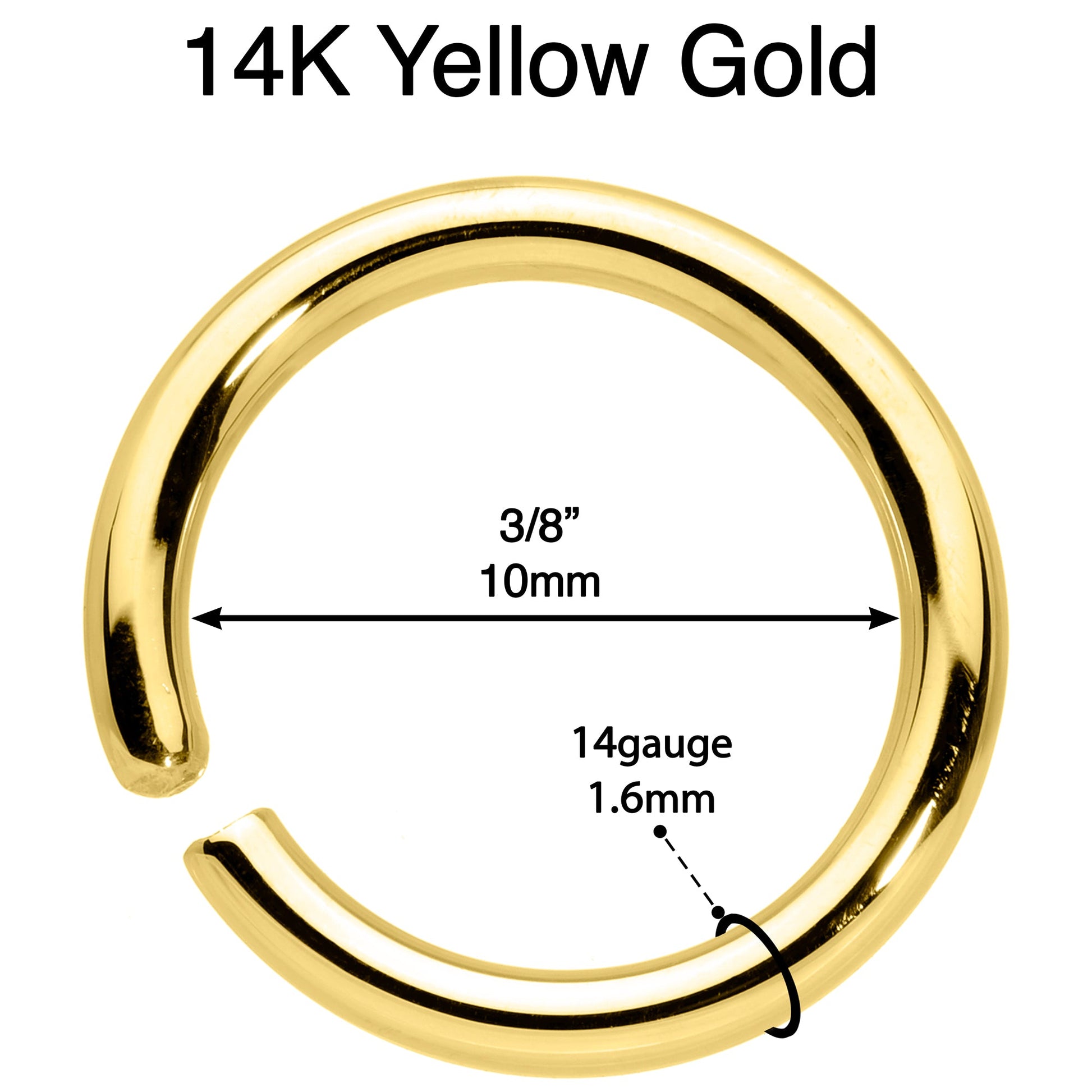This 14 gauge closure ring will have your piercings looking as good as gold! It's made with a 10mm solid 14k yellow gold circular ring and is handcrafted and hand-polished too. It's easy to insert and remove - Just give it a light twist, insert it into your piercing and gently bend it closed. And you can rock this jewelry in multiple piercings including septum and some conch piercings. And it's handmade in the USA!Specifications