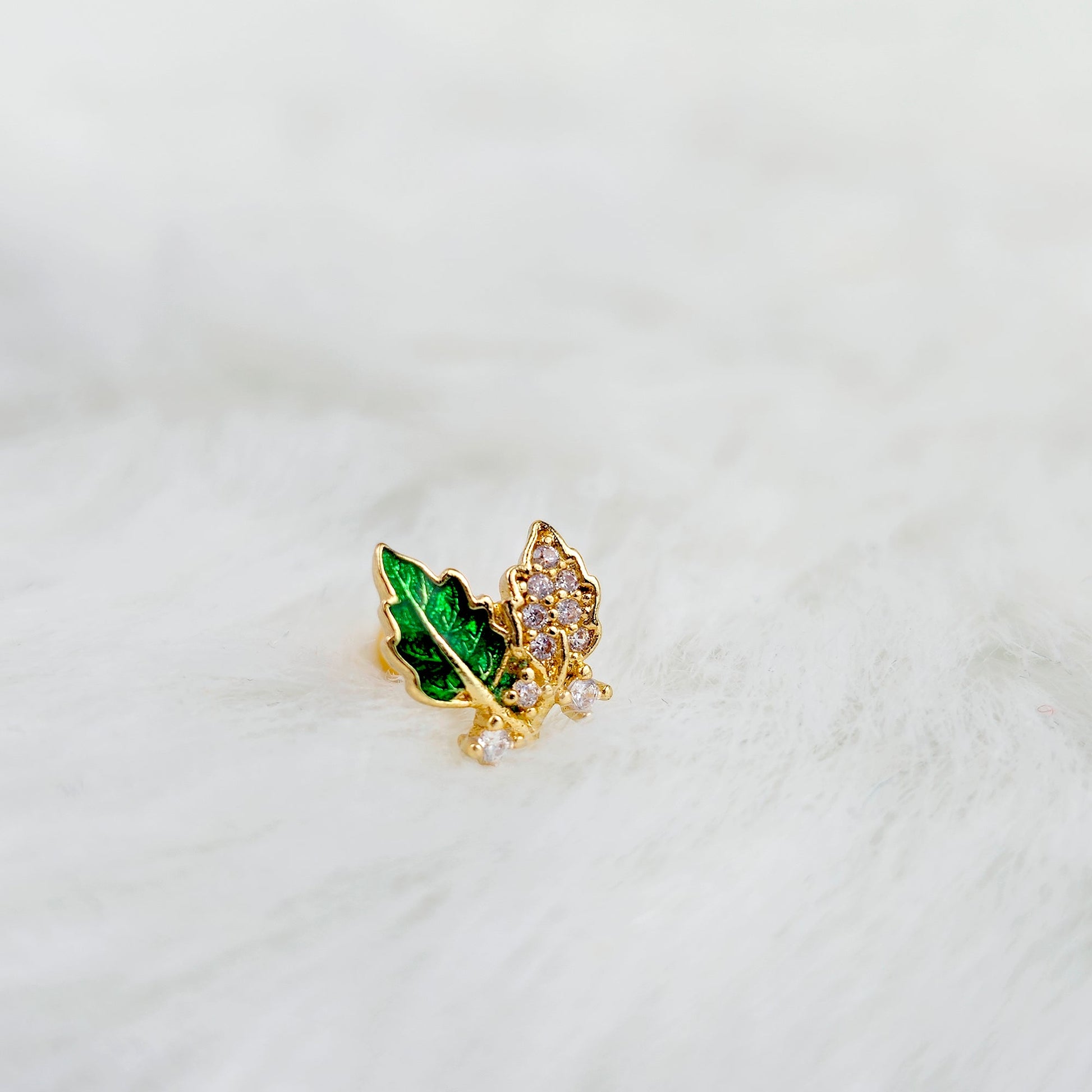 Elevate your style with this exquisite Green Leaf tragus earring, adorned with sparkling gems and faux pearl accents for a touch of natural glamour. This lip piercing can be worn as a labret, monroe or even ear jewelry as a flat back earring or for a tragus piercing.