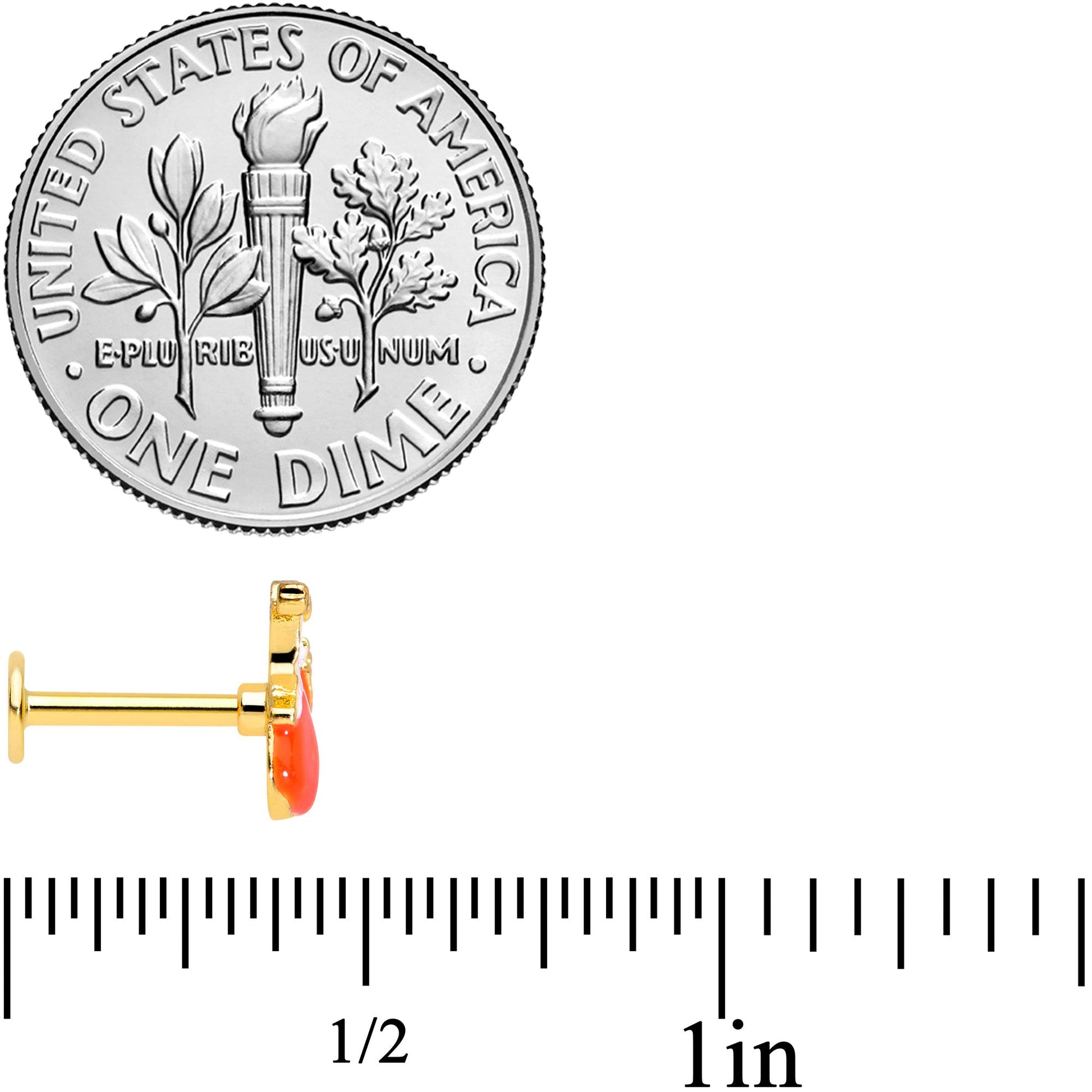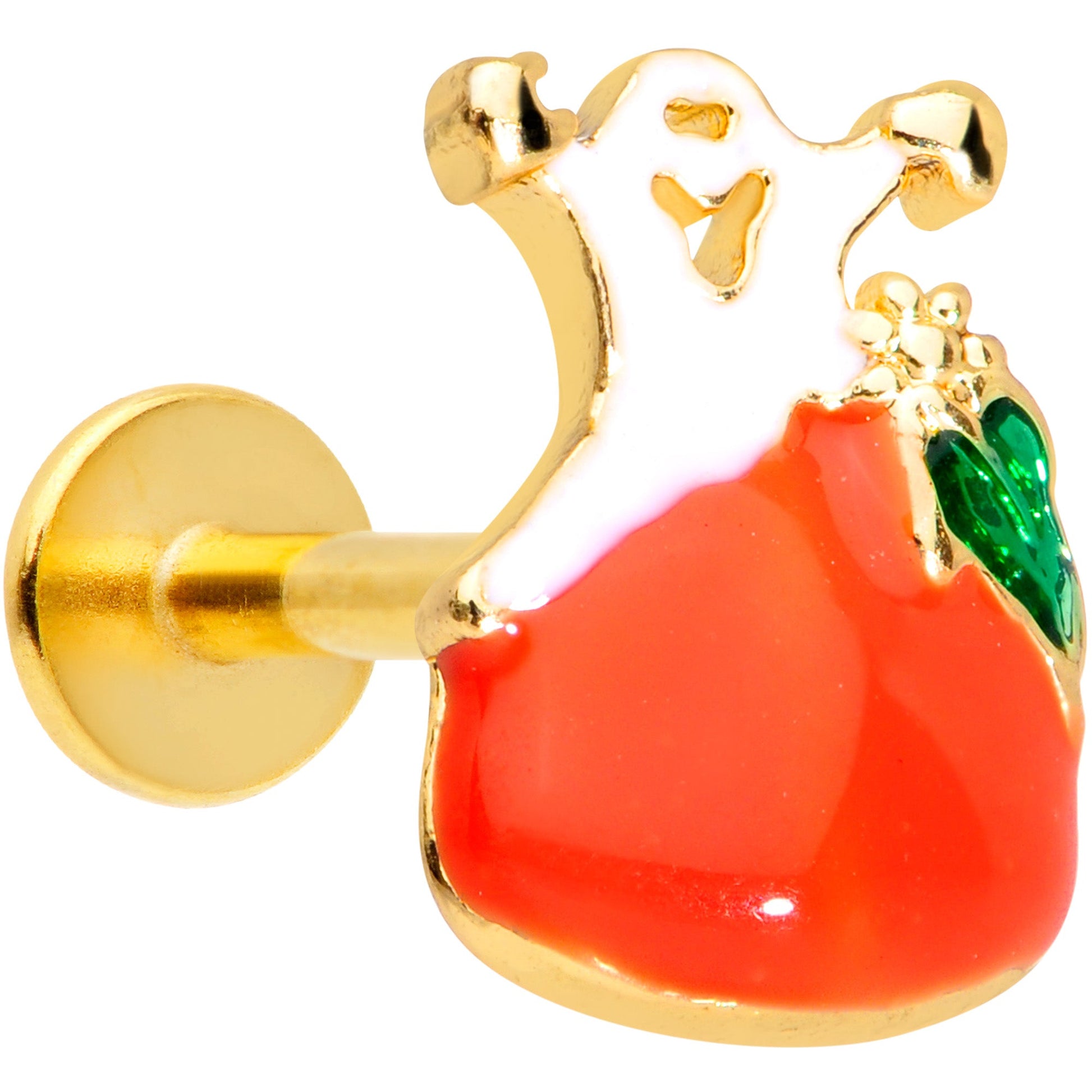 Oooh, this 16 gauge lip ring is downright haunting! It's made with an 8mm gold tone PVD over 316L surgical grade stainless steel straight barbell with a flat disc end. It features an orange pumpkin charm, embellished with textured detailing and a small green leaf. Appearing to rise from within the pumpkin is a ghost, with a cut-out mouth in a wide smile. And you can rock this ghost in multiple piercings including lip, monroe, tragus, helix, and some conch piercings. This happy Halloween haunter is sure to glam up your cartilage piercing just in time to give you the spirit of the season!