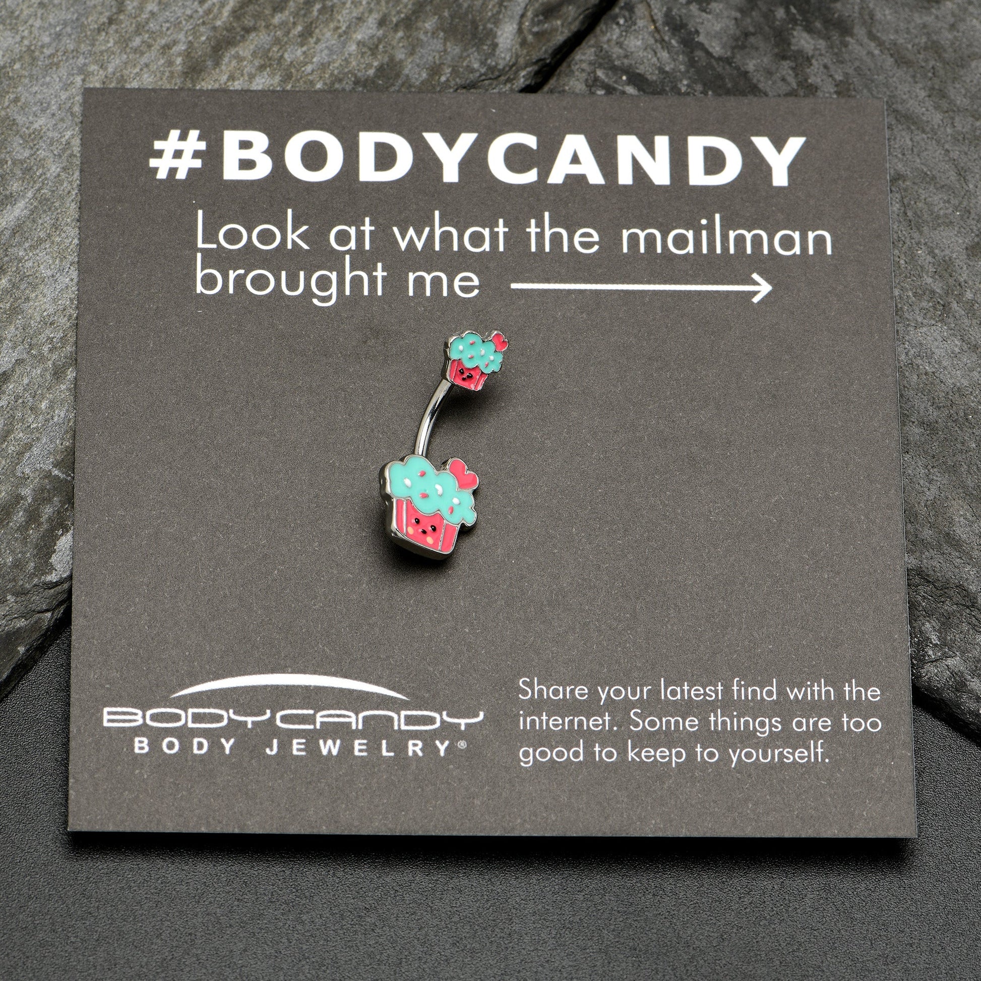 Give your belly piercing a delicious new look with this 14 gauge navel ring! It's made with an 3/8" durable 316L surgical grade stainless steel curved barbell. Each of the ends features an inlaid cupcake charm, with blue frosting and pink and white sprinkled embellishments. The cupcakes each have a pink base featuring a cheerful face. You'll have the yummiest looking belly piercing around with this tasty cupcake belly button piercing ring!Specifications