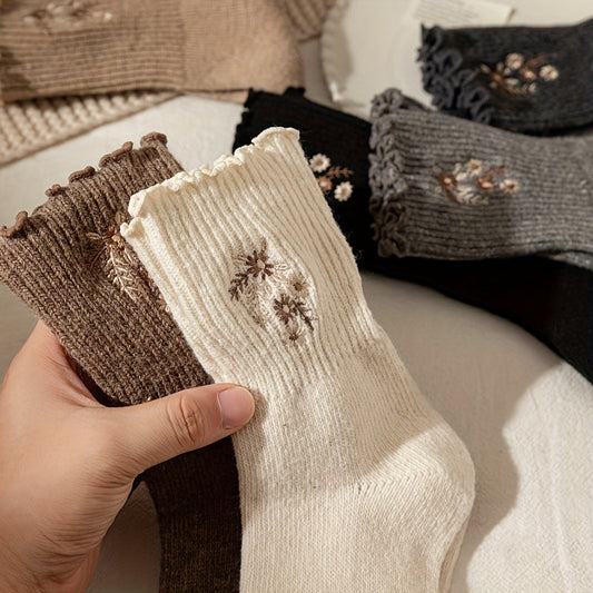 6 Pairs Floral Embroidery Socks, Comfy & Soft Lettuce Trim Socks, Women's Stockings & Hosiery