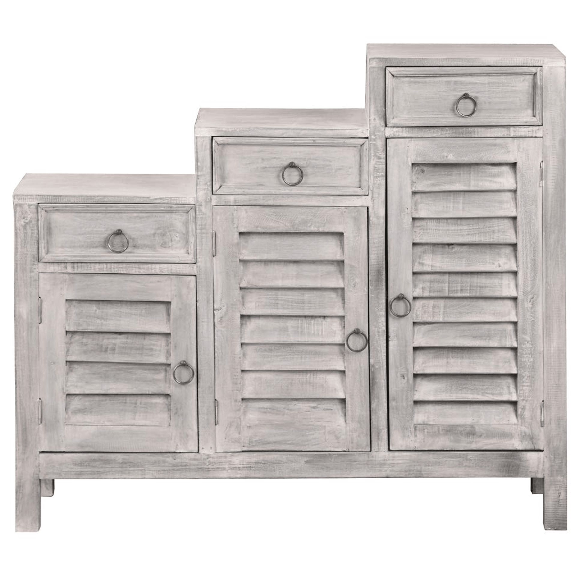 Arriving fully assembled, the Cottage Three-Tiered Distressed Light Gray Shutter Cabinet invites you to transform your space effortlessly, providing a seamless blend of beauty and practicality. Illuminate your home with this captivating cabinet that truly stretches the boundaries of design and utility.