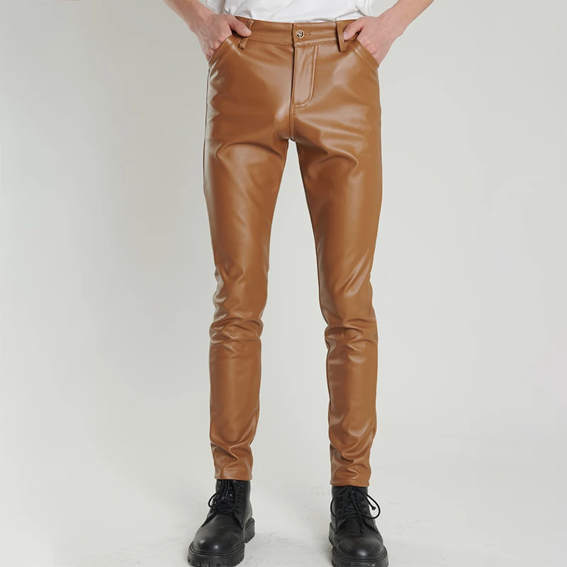Spring Autumn Men's Leather Pants Skinny Fit Elastic Fashion PU Leather Trousers Punk Cosplay Dance Pants