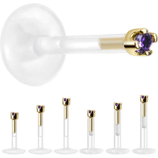 Solid 14K Yellow Gold February 1.5mm CZ Bioplast Push in Labret Monroe