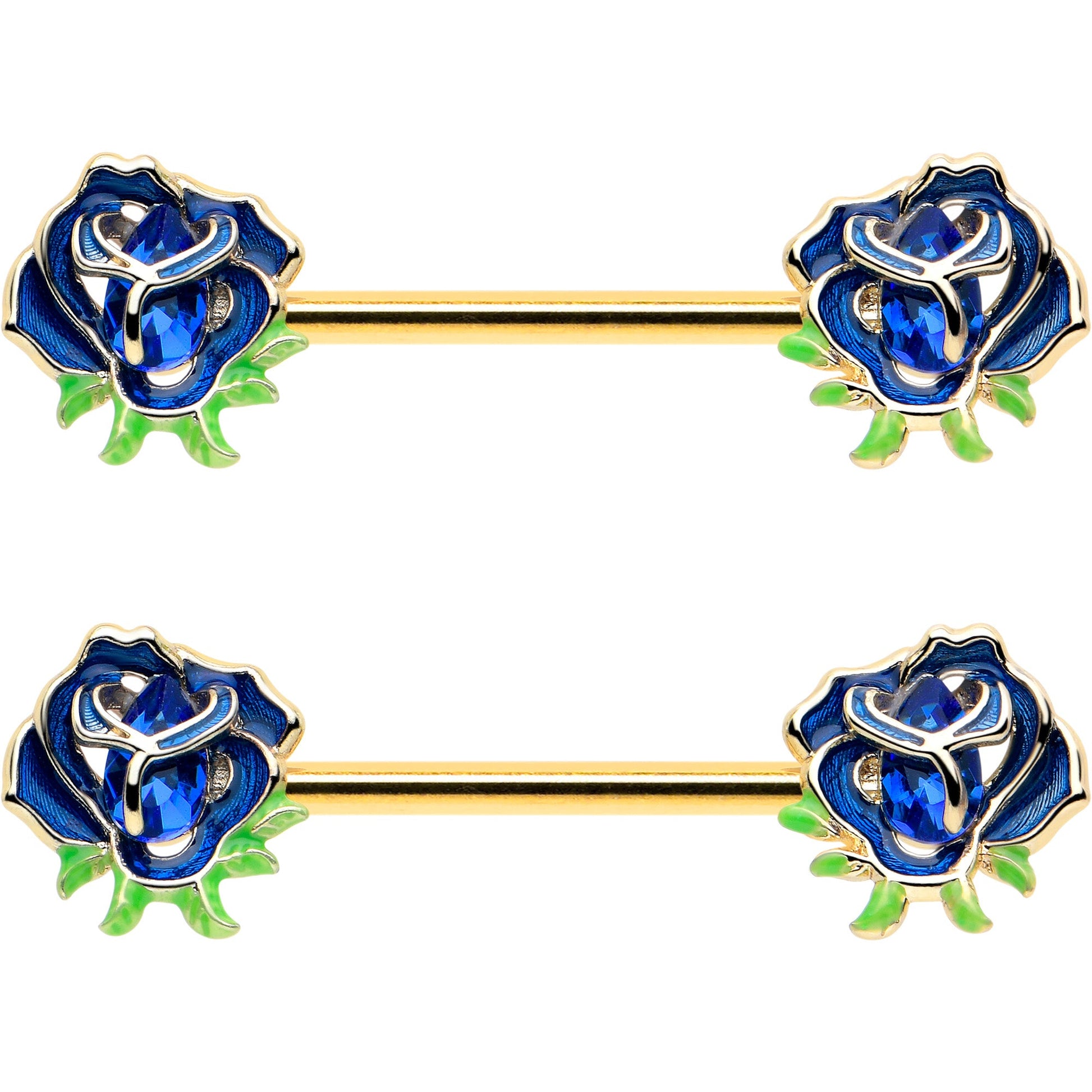 Dive into the depths of style with this 14 gauge nipple jewelry. It's made with 14mm gold tone PVD over 316L surgical grade stainless steel straight barbells. Each of the ends features a flower charm, inlaid in the deepest of blues. They are further embellished with matching deep blue gem centers and green leafy detailing at the bottoms. Get the blues in the best way possible with these fabulous, floral flower nipple piercing rings. Sold as a set of two.Specifications