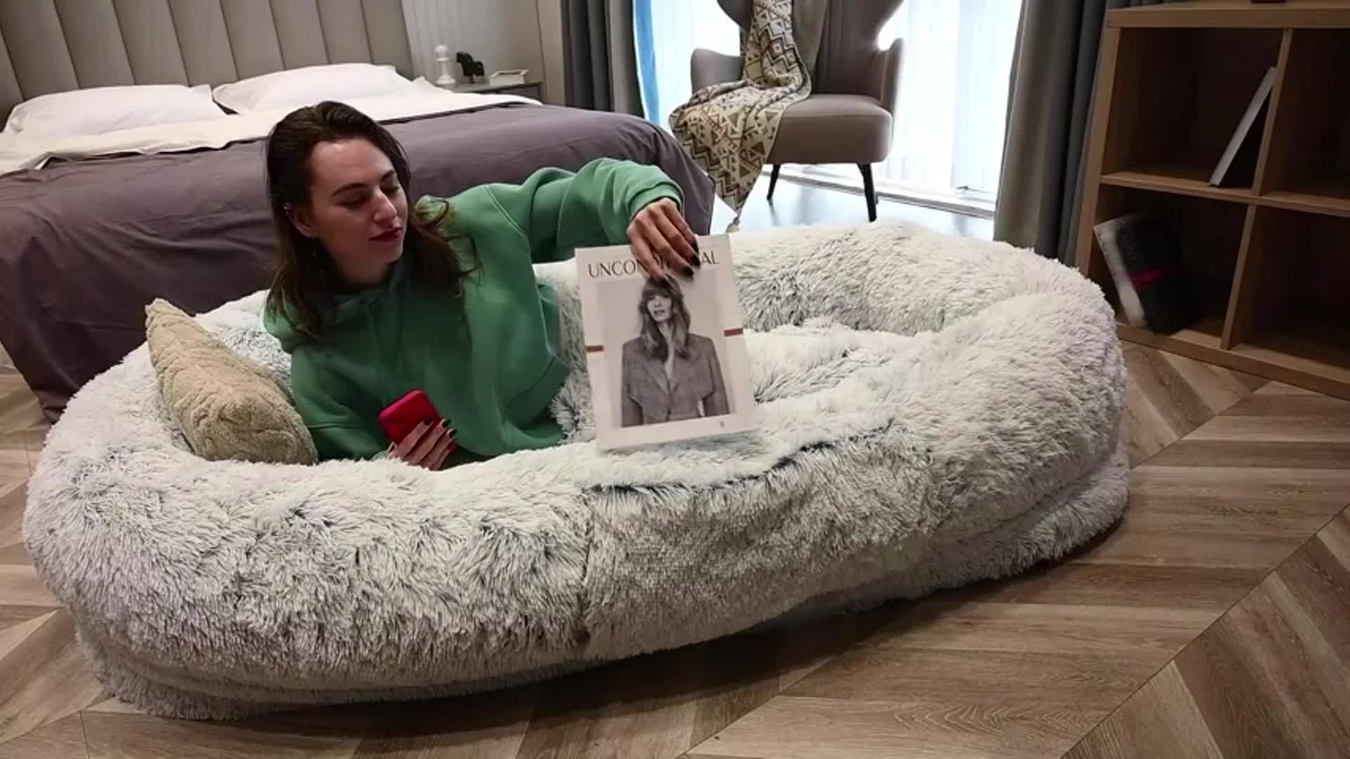 Orthopedic Human Dog Bed 71"x45"x12" Oval Washable Faux Fur Pet Bed with Plump Pillow, Blanket & Strap - Non-Slip Spa Design for All Dog Sizes, Grey, Cozy Nap Spot, Cozy Aesthetic, Durable Polyester, Home Lounging