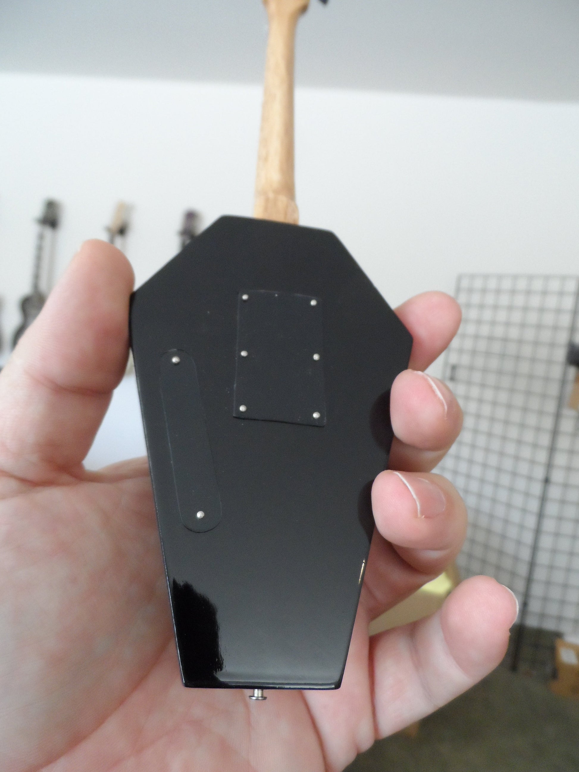 This miniature 1:4 scale replica model instrument can fit in the palm of your hand. It is approximately 10.5 inches in length and comes with a display stand. Each guitar is individually handcrafted from solid woods, plastics, resins, etc. (depending on the guitar style) with plastic tuning keys. Check out our listings for guitar hard cases and miniature amplifiers to complete your guitar set-up.