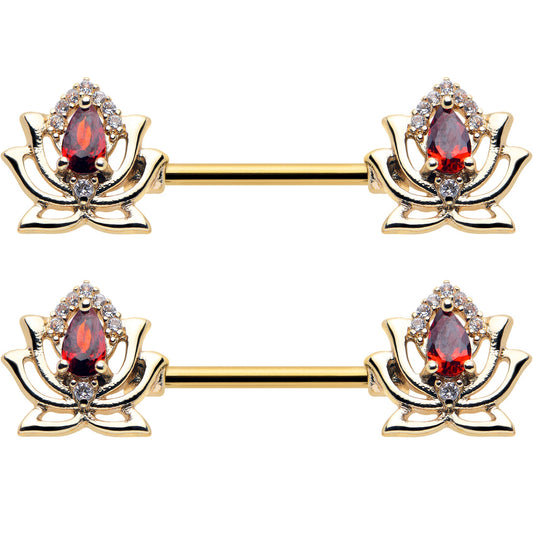 14G 9/16 Red Gem Gold Tone Royal Lotus Barbell Nipple Ring Set