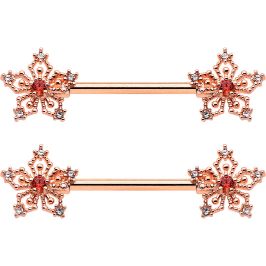 14G 9/16 Red Gem Rosy Hue Texture Snowflake Barbell Nipple Ring Set