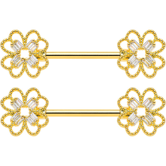 14G 5/8 Clear Gem Gold Tone Texture Cross Barbell Nipple Ring Set