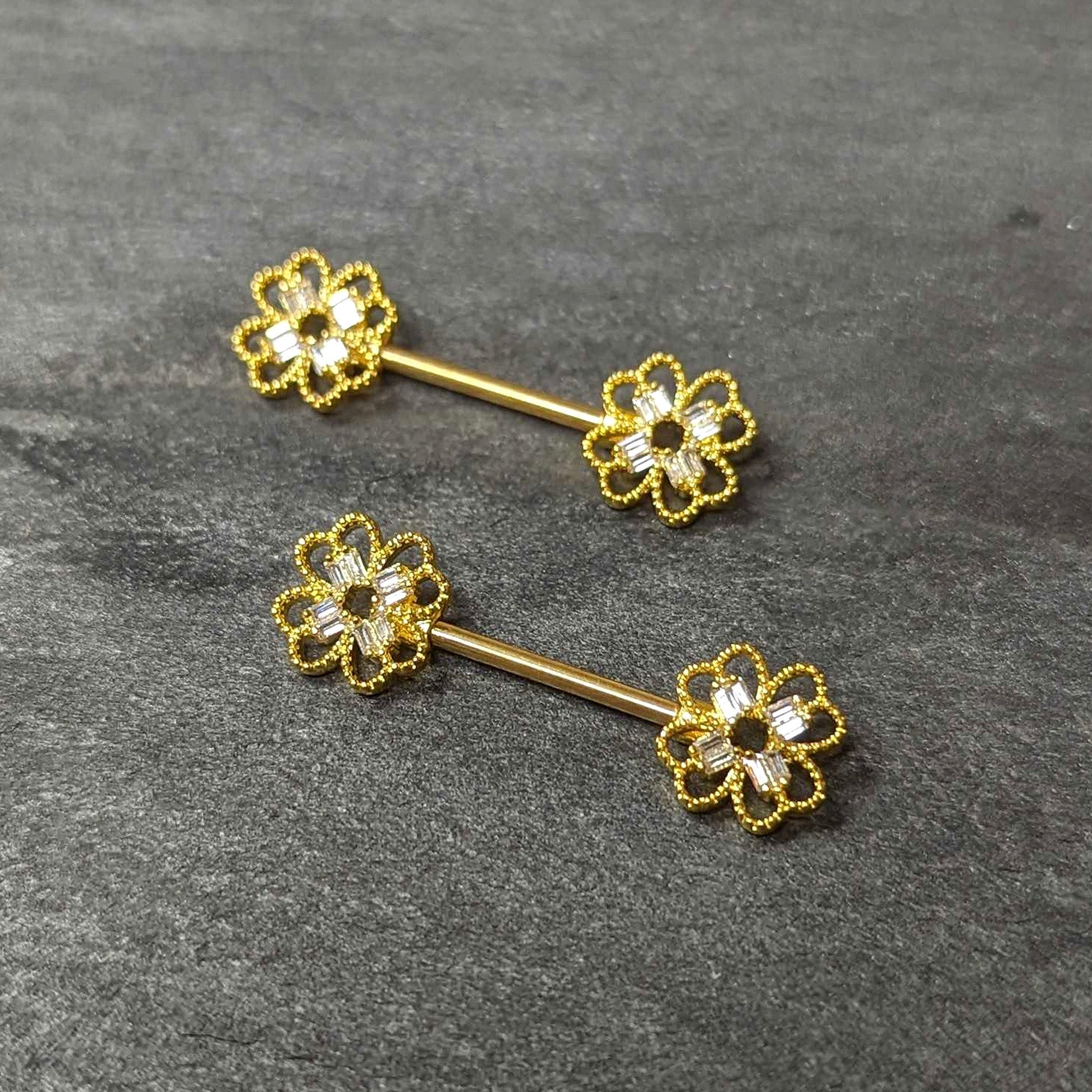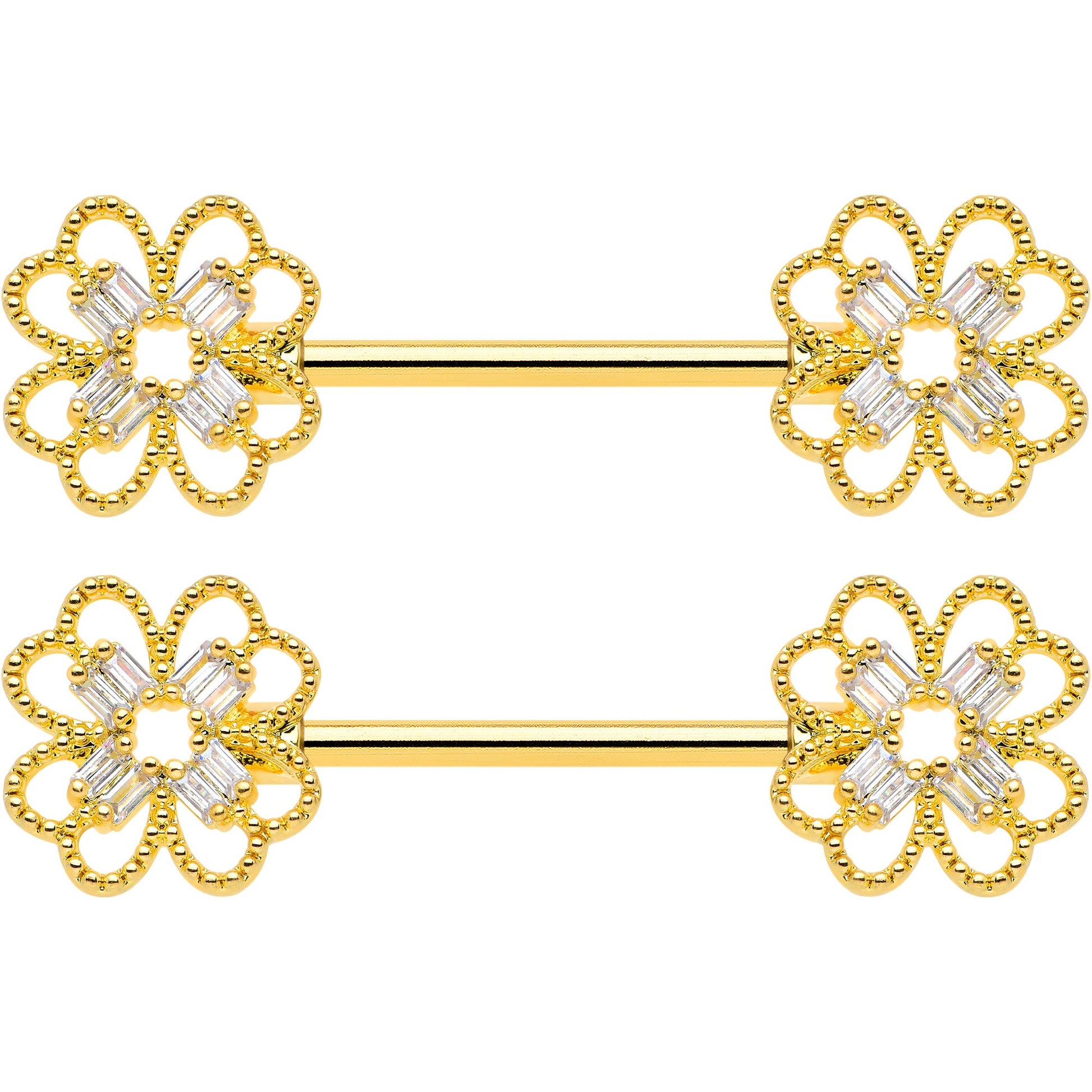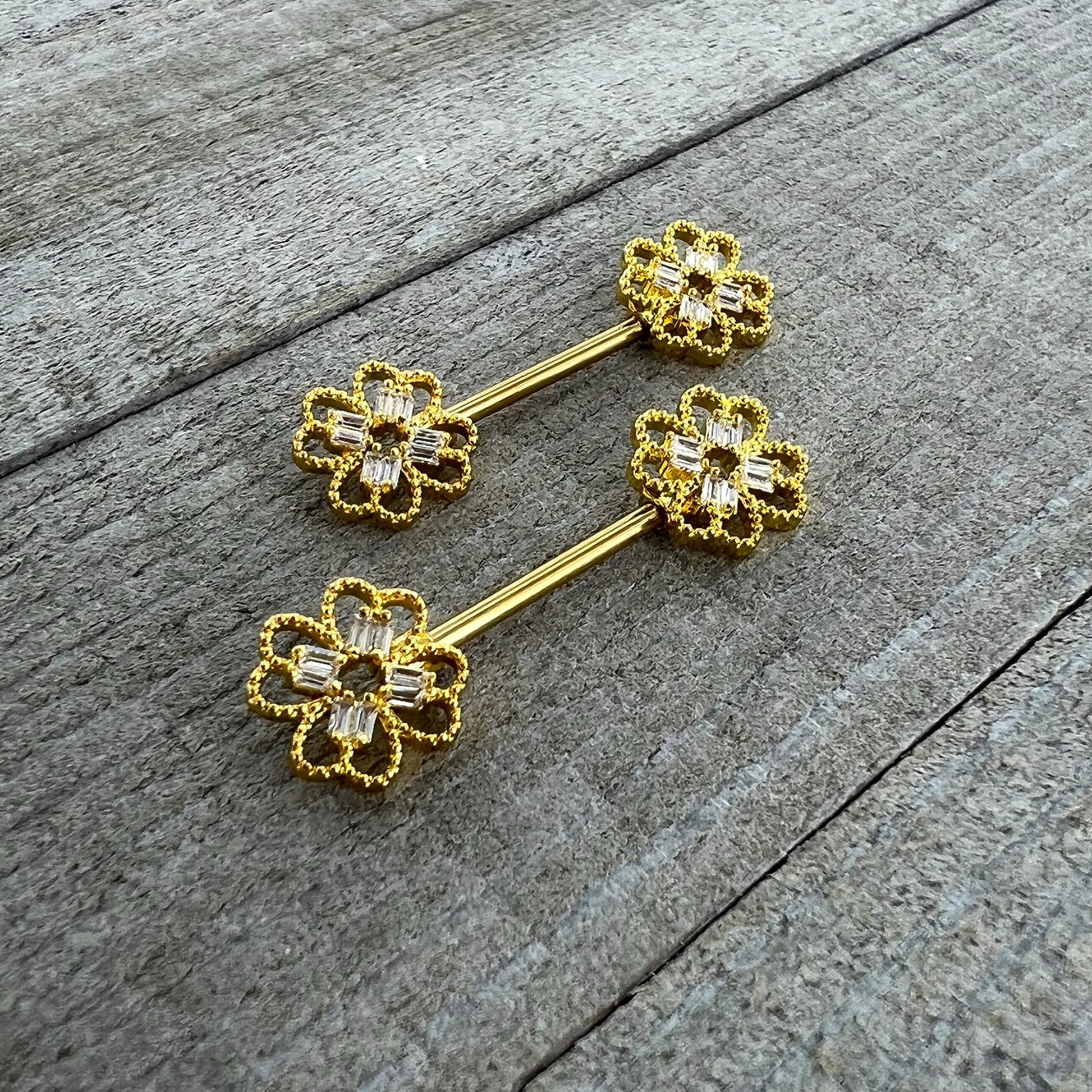 14 Gauge 5/8 Clear Gem Gold Tone Texture Cross Barbell Nipple Ring Set