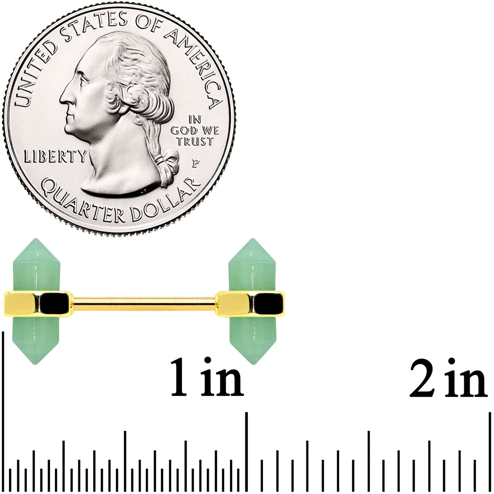 If you're into tie-dye and incense, this 14 gauge nipple jewelry is sure to give you a happier aura! It's made with 16mm gold tone PVD over 316L surgical grade stainless steel straight barbells. Each end features a band holding a vertical green gem, with its classic obelisk shape. While we can't claim they have any magical powers, they will certainly look magical in your nipple piercings! Sold as a set of two.