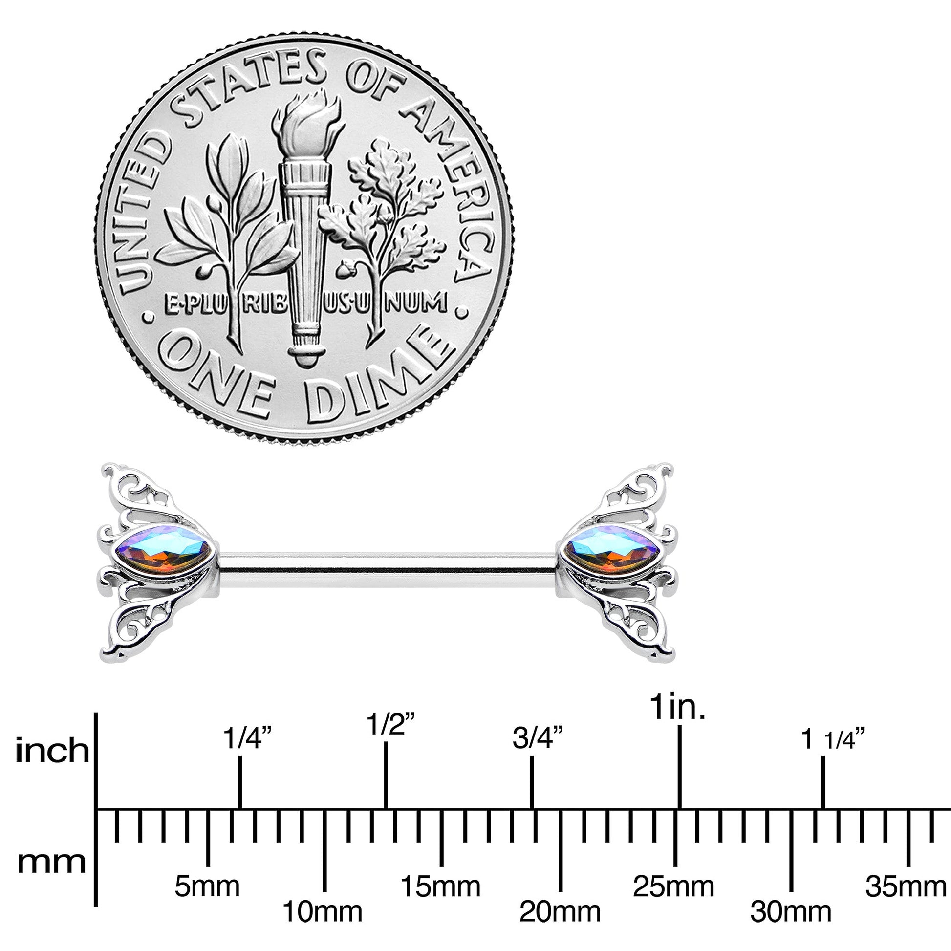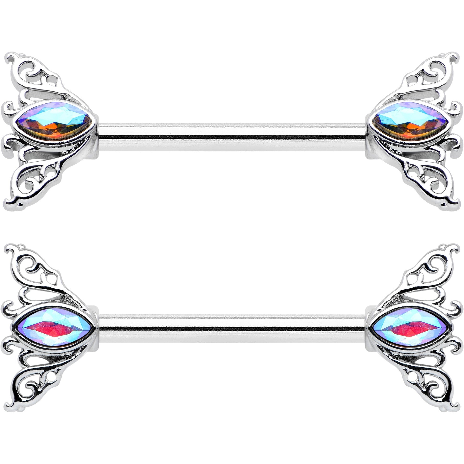 Ride a wave of style with this 14 gauge nipple jewelry! It's made with 14mm durable 316L surgical grade stainless steel straight barbells. Each of the ends features an Art Deco charm of waves and scrolls. Set at each of the centers is an oval shaped aurora gem that adds a classic touch of color and glamour to a timeless look. You'll be waving hello to a whole new look with these sleek and timeless nipple piercing rings. Sold as a set of two.Specifications