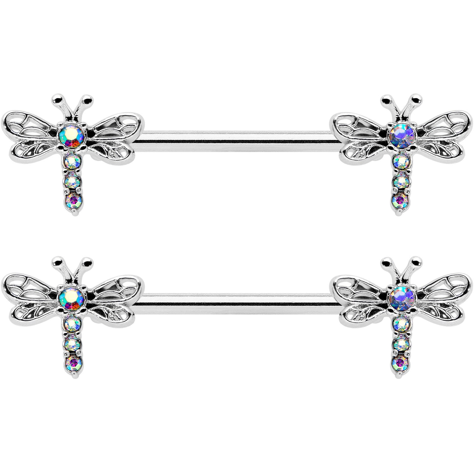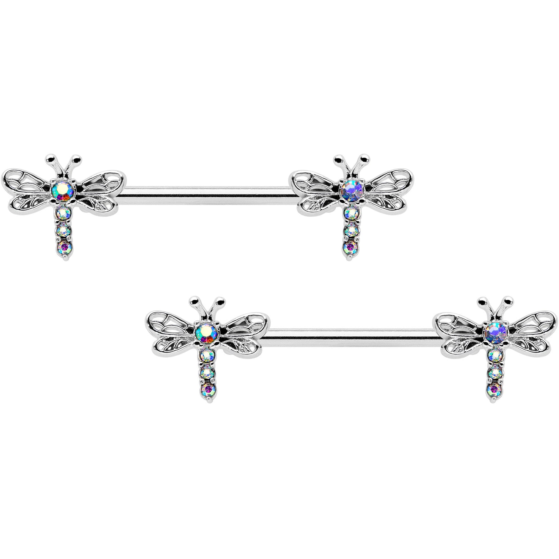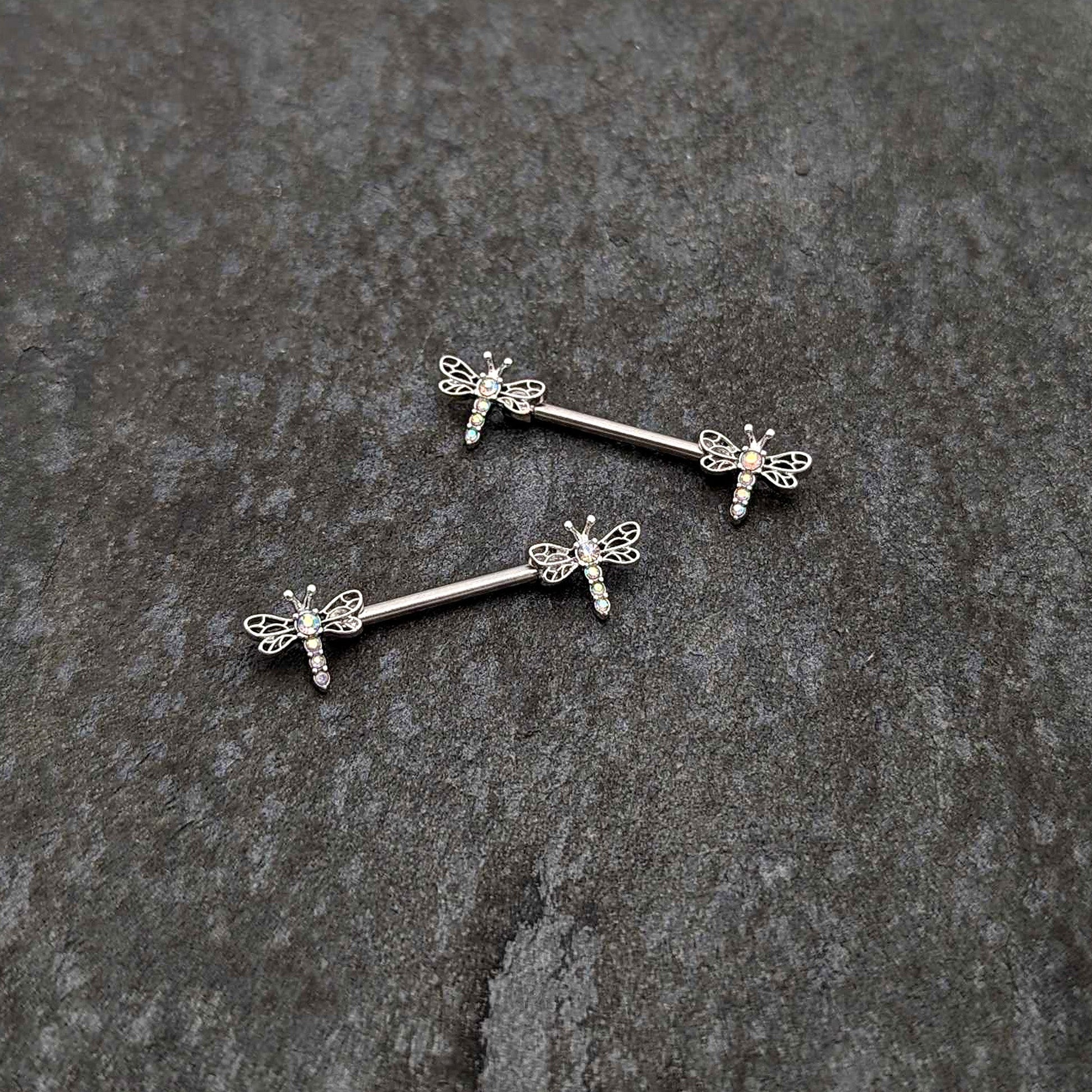 14G 9/16 Aurora Gem Ornate Dragonflies Barbell Nipple Ring Set