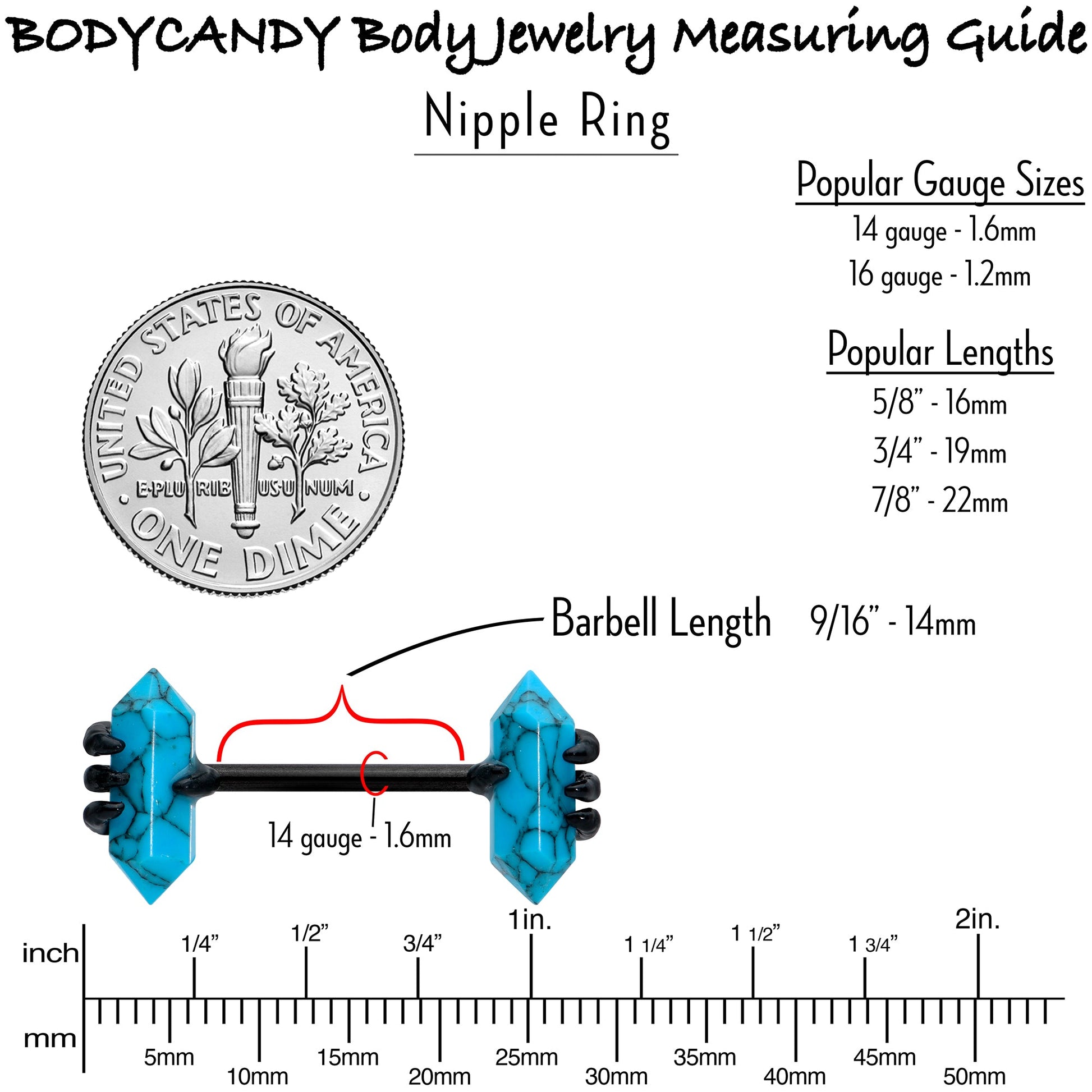 If you're into tie-dye and incense, this 14 gauge nipple jewelry is sure to give you a happier aura! It's made with 14mm black PVD over 316L surgical grade stainless steel straight barbells. Each end features a trio of bands holding a vertical blue turquoise stone, with its classic obelisk shape. While we can't claim they have any magical powers, they will certainly look magical in your nipple piercings! Sold as a set of two.