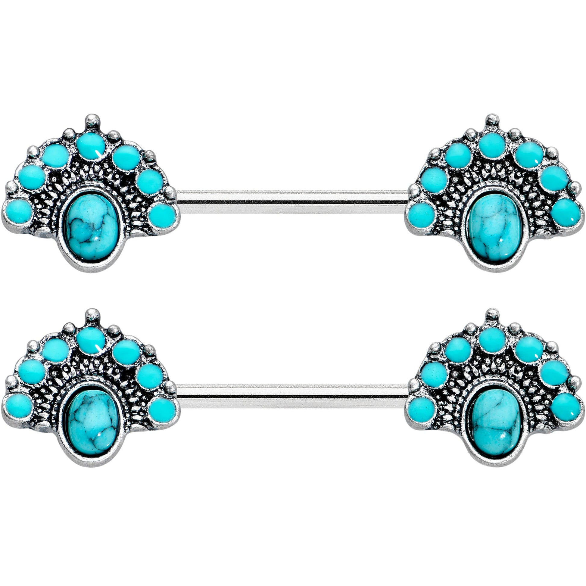 Surround your nipple piercings in gorgeous style with this 14 gauge nipple jewelry! It's made with 14mm durable 316L surgical grade stainless steel straight barbells. Each of the ends features an abstract shield charm featuring an oval blue turquoise stone set within a curve of round blue turquoise stones and embellished with burnished detailing. Rock some major style no matter which way you wear it with these stunning shield inspired nipple piercing rings! Sold as a set of two.Specifications