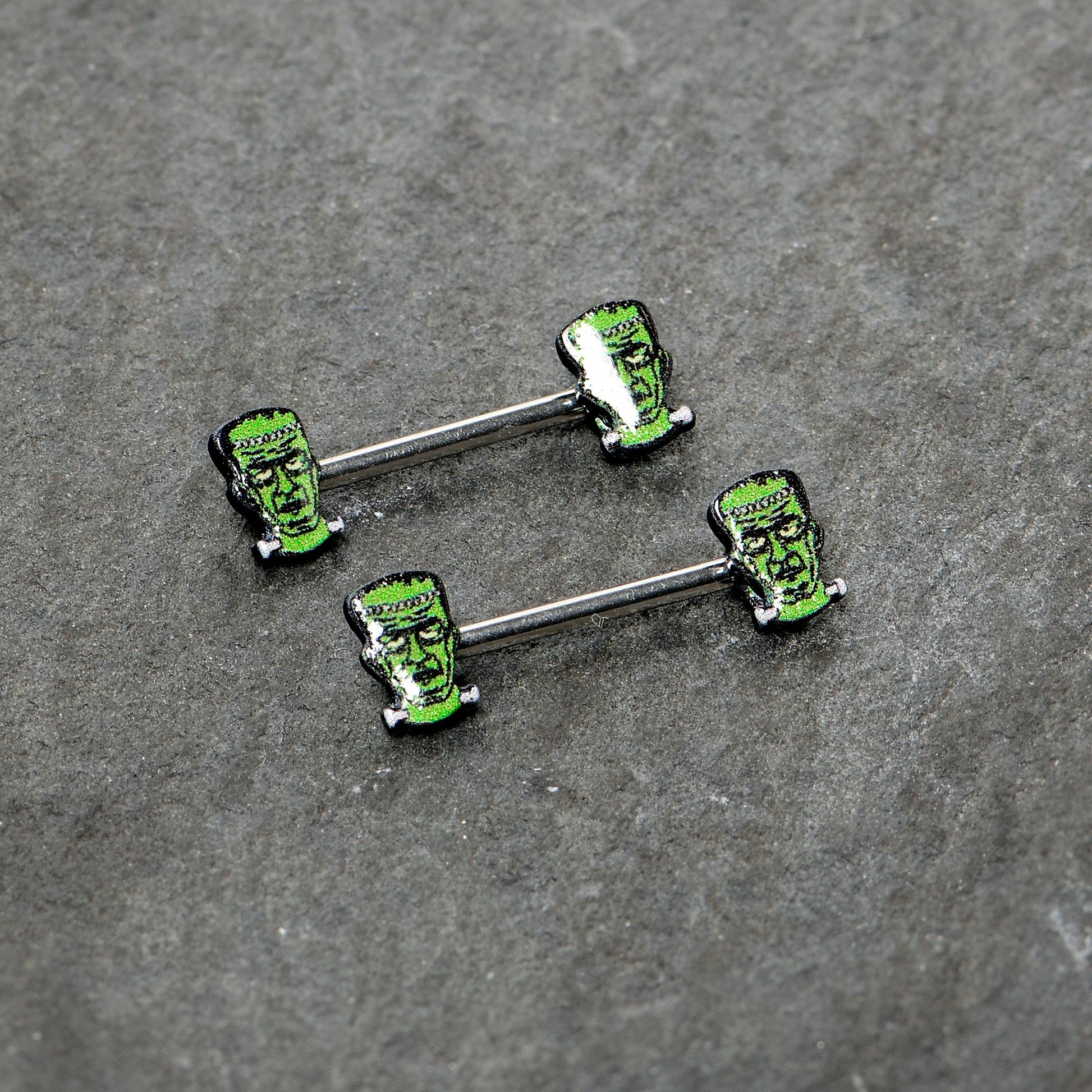 It's alive....or it certainly looks lifelike on this 14 gauge nipple jewelry! It's made with 14mm durable 316L surgical grade stainless steel straight barbells. Each of the ends features a Frankenstein's monster charm, from the neck up. The monster's heads are green and feature a realistically expressionless expression. They glows in the dark when the lights go down for a perfect Halloween look. Grab your pitchforks and torches, Frankenstein's monster is loose when you're rocking these wonderfully horrifying nipple piercing rings! Sold as a set of two.Specifications