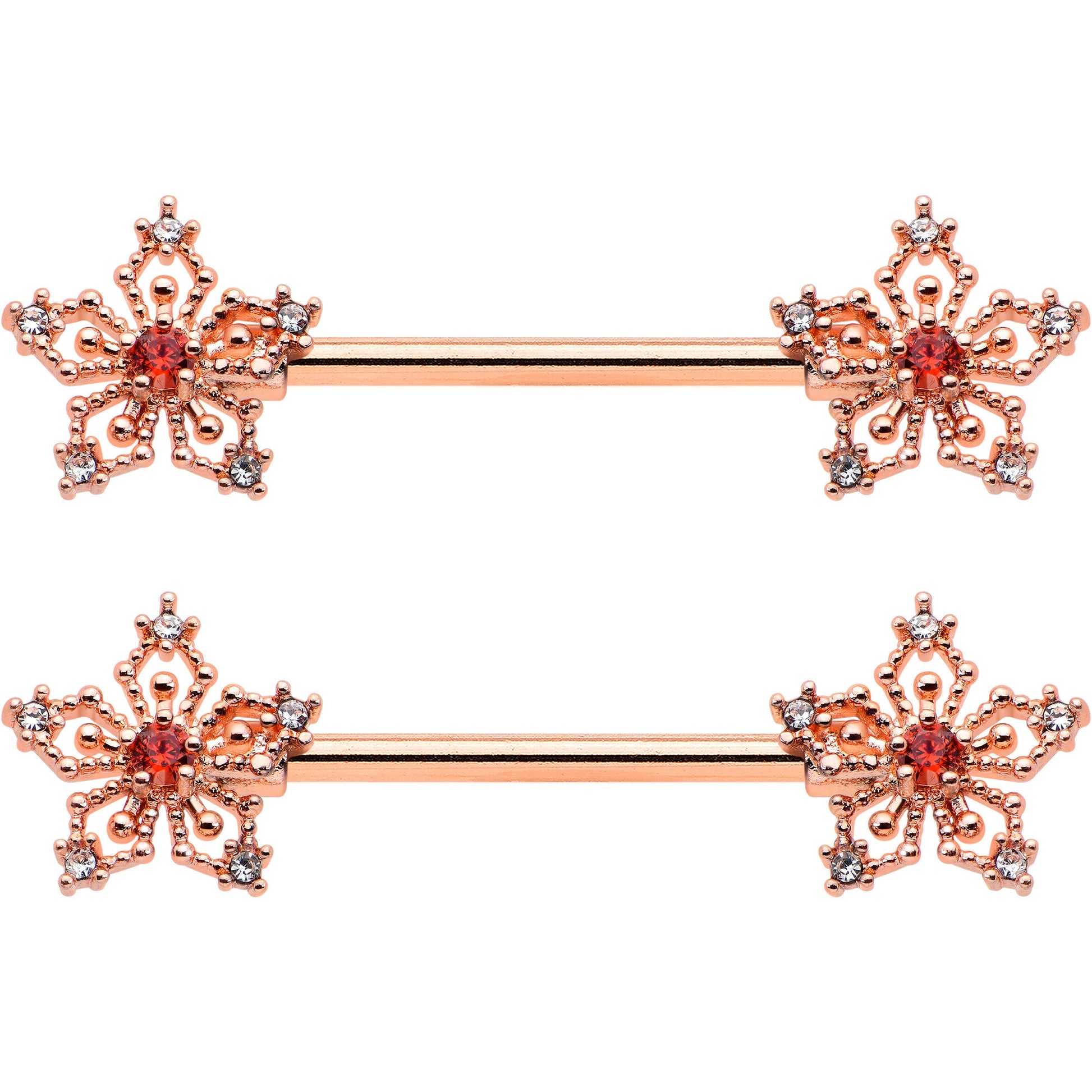 Make your nipple piercings a star this Christmas with this 14 gauge nipple jewelry! It's made with 14mm rose gold tone PVD over 316L surgical grade stainless steel straight barbells. Each of the ends features a snowflake charm, with textured detailing, further embellished with clear gems at the points and a red gem at the center. You'll feel like a star no matter the season with these stylish snowflake nipple piercing rings! Sold as a set of two.