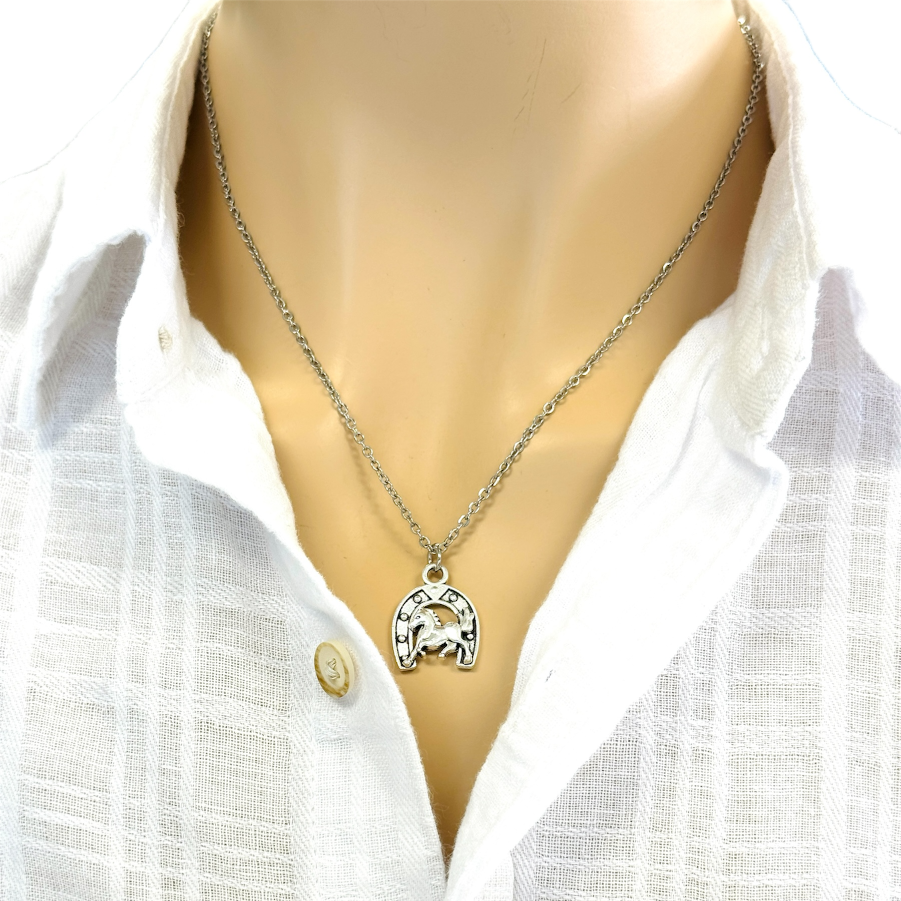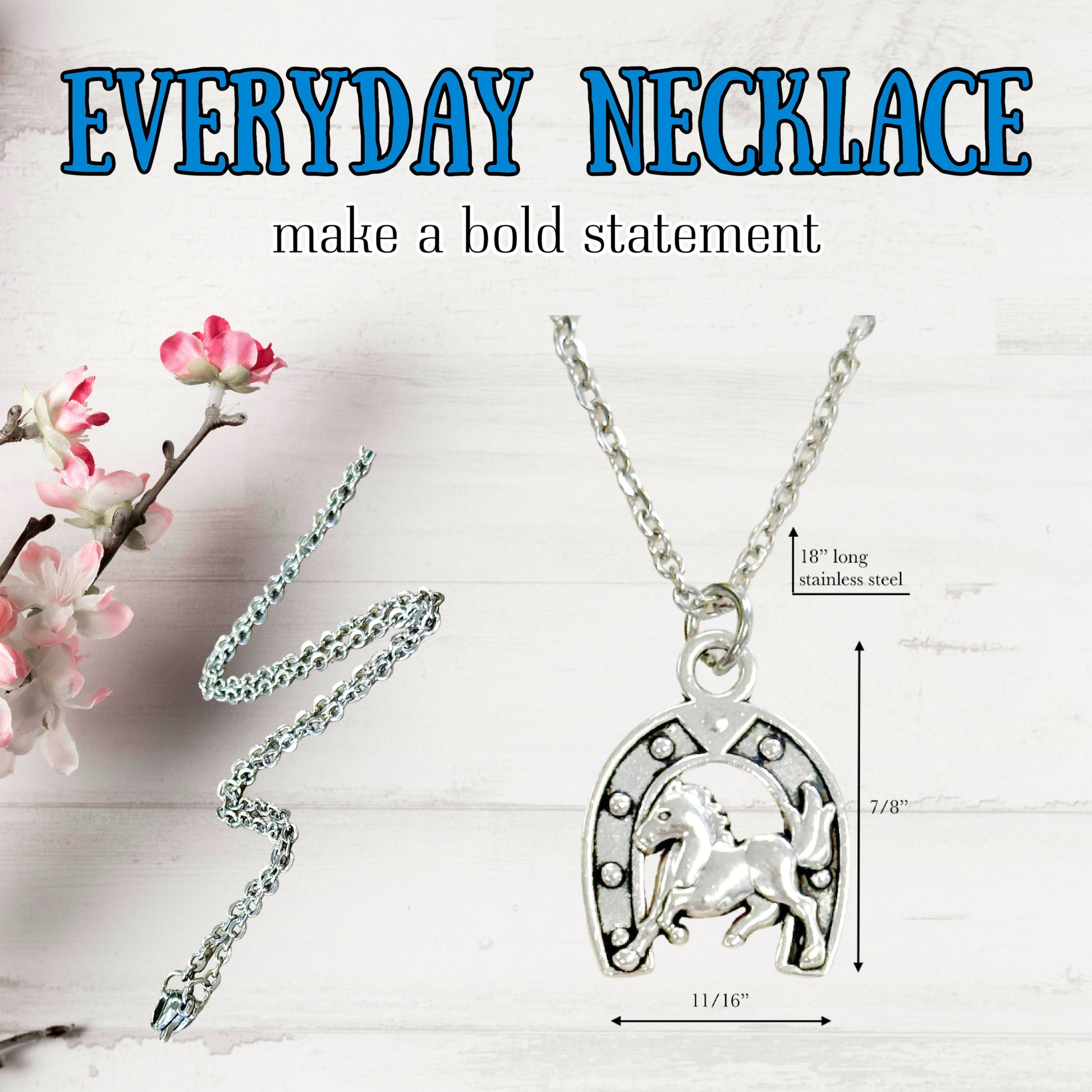 Add a touch of luck to your style with our horse necklace featuring a horseshoe pendant. Perfect for horse enthusiasts and anyone looking for a fun accessory. Let this playful piece bring a smile to your face. (Giddy up!)