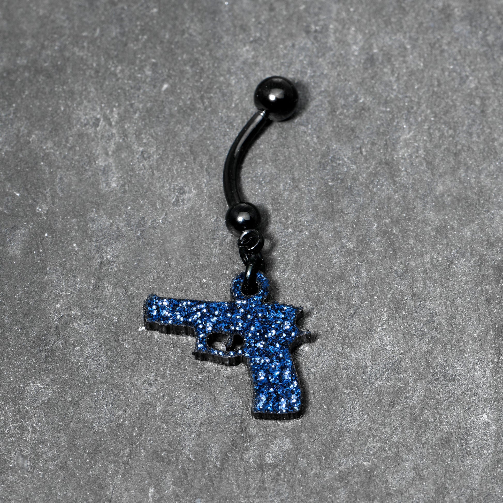 This 14 gauge navel ring is made with a 7/16" black PVD over 316L surgical grade stainless steel curved barbell with a 5mm top ball end. Dangling from the bottom ball end is a blue gun charm, paved with glitter. This belly piercing jewelry is sure to get attention.Specifications